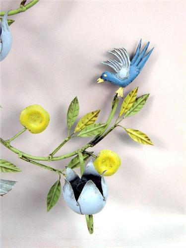 In the shape of a bird-laden apple tree. Together with a painted metal floral wall candelabra and two stamped and painted tin candlesticks. 4 pieces. From 12 1/2"h to 35"h