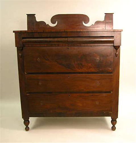 A LATE FEDERAL CHERRYWOOD AND MAHOGANY BUTLER'S DESK; Probably New York, the deep drawer opening to an interior fitted with short drawers, pigeonholes, and a baize-lined writing surface, distressed 4'7"h x 46"w x 23"d