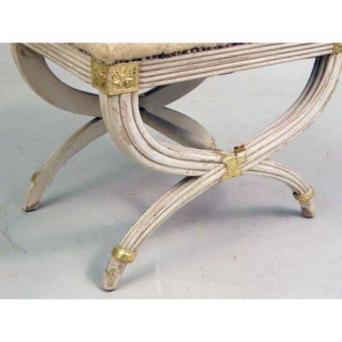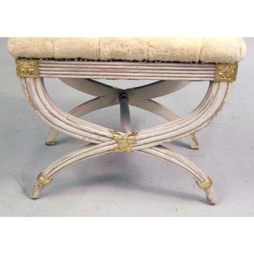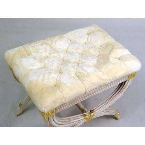 A LATE LOUIS XVI STYLE PAINTED AND PARCEL-GILT STOOL<BR><BR>With a rectangular button-tufted upholstered seat in white fabric