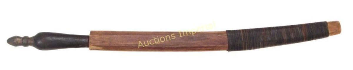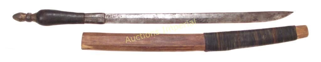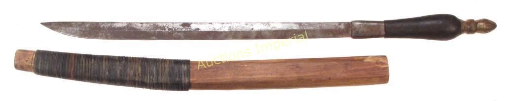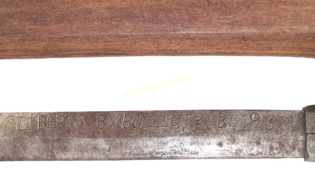 A massive example, rarely encountered. With dark hardwood grip and faceted iron ferrule, the long, straight blade with pronounced central ridge and radiused tip. Inscribed at the right forte: LIBERIA. B.V. BUZIE TRIBE. 1937. In its wooden scabbard with cord binding. Light wear. Overall length 58.5 cm.