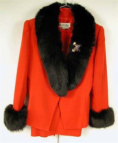 A LILLI ANN RED WOOL SUIT WITH BLACK FUR TRIM;