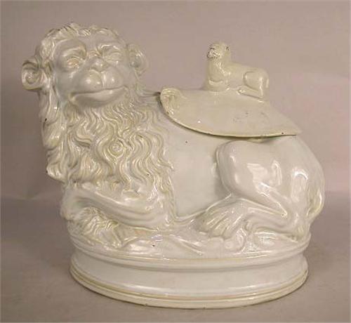 A LION-FORM COVERED CONTAINER; With animal finial on lid, 11"h, losses