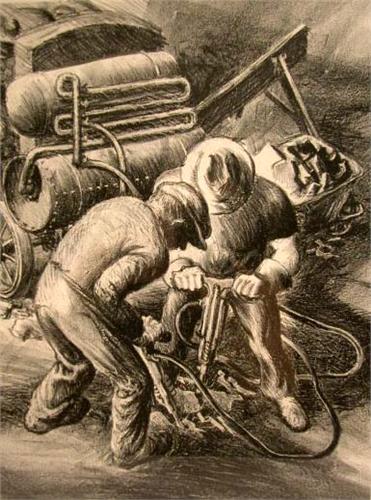 A LITHOGRAPH; "The Drillers" by Charles Keller, 1937, edition of 25, pencil signed lr. "Charles Keller 1937", title in pencil, 14-1/4" x 10-3/4", matted and framed Provenance: Associated American Artist