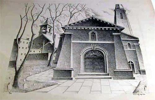 Titled "Church", signed Arnold Wiltz (1889-1937) and dated Aug. 1930, numbered 23/35. 14 3/4"h x 15 1/2"w.