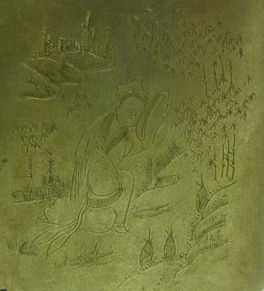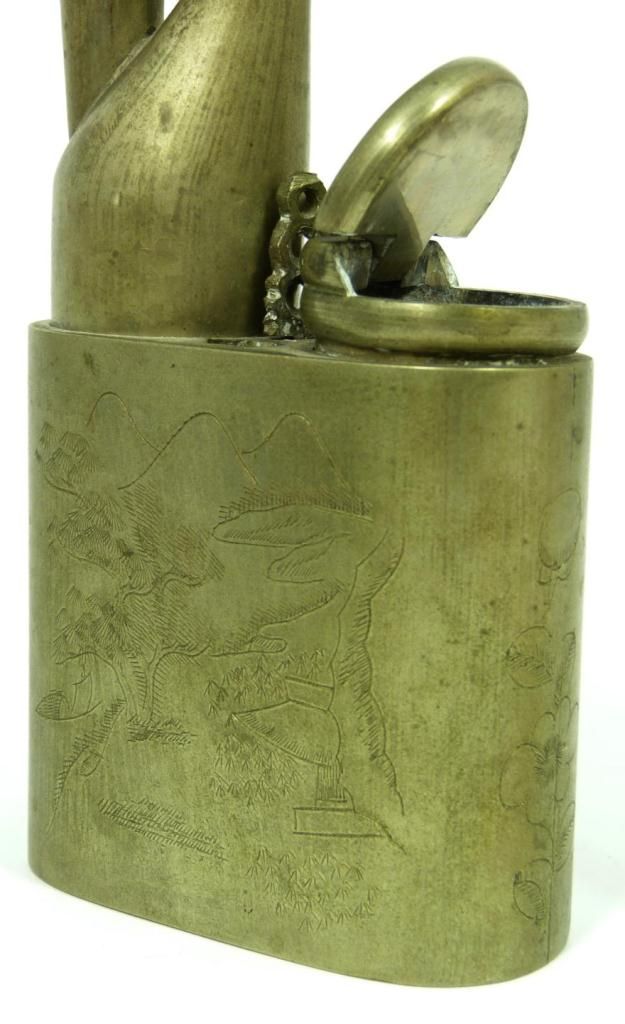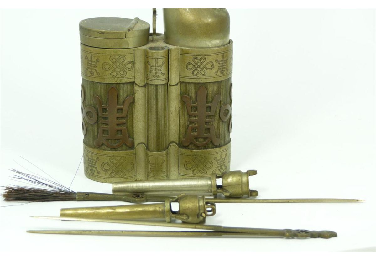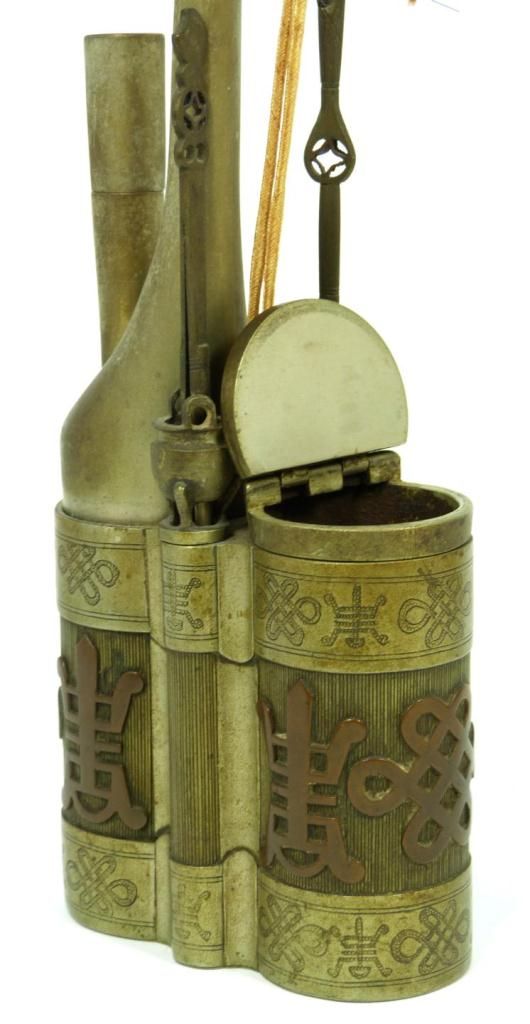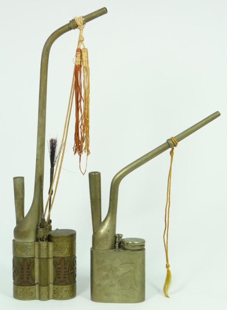 A lot of 2 Chinese silvered metal opium pipe sets. Each having removable pipe, opium vessel, alternative bowls and cleaning tools. One having chased landscape scenes and the other having chased and applied designs. Early 20th century. Largest measures 14 1/2" height (36.8cm). Total weight of 1131 grams.