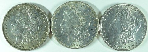 A LOT OF ( 3 ) DIFFERENT MORGAN SILVER DOLLARS, ALL BETTER THAN AVERAGE CIRCS.