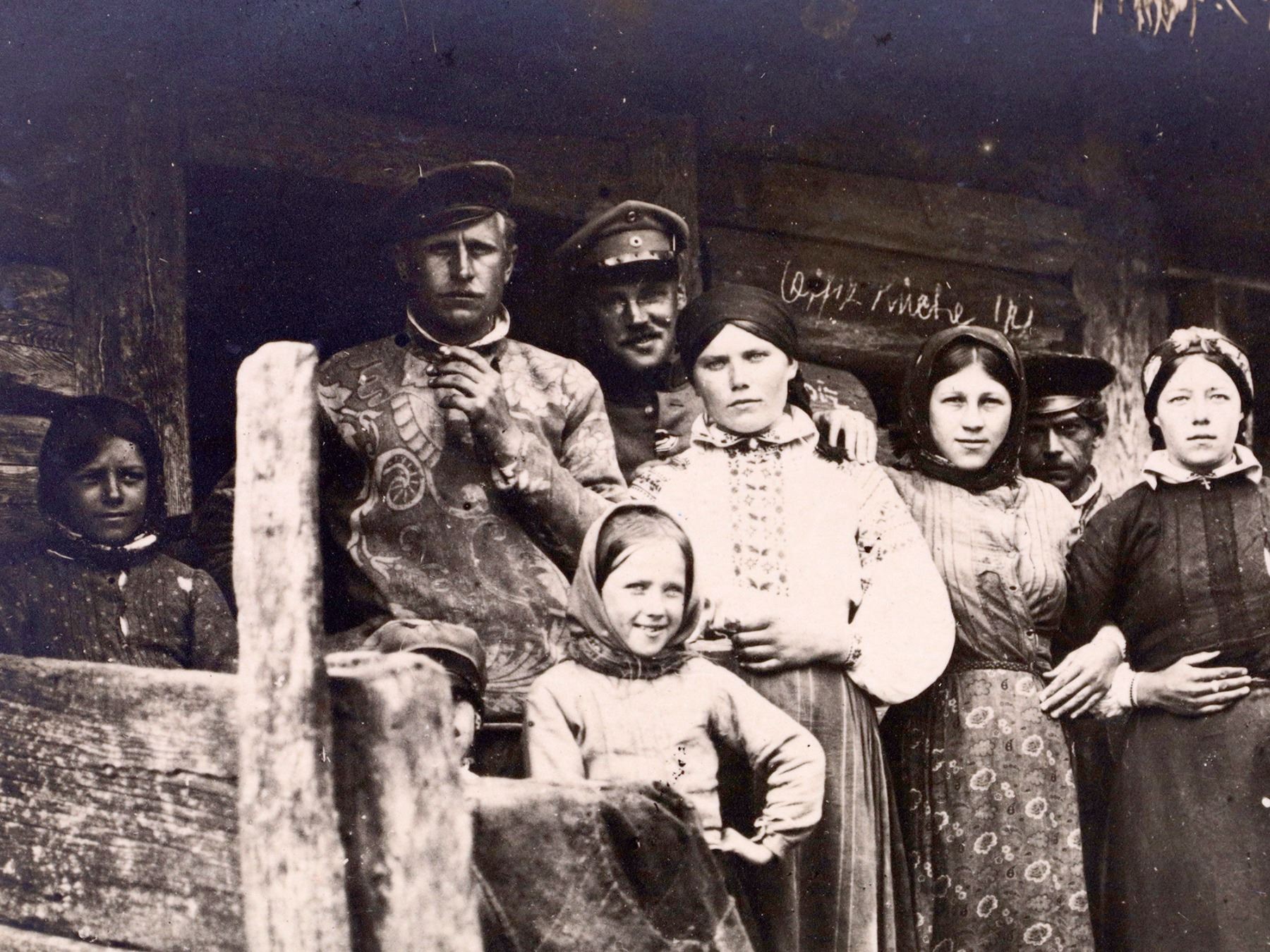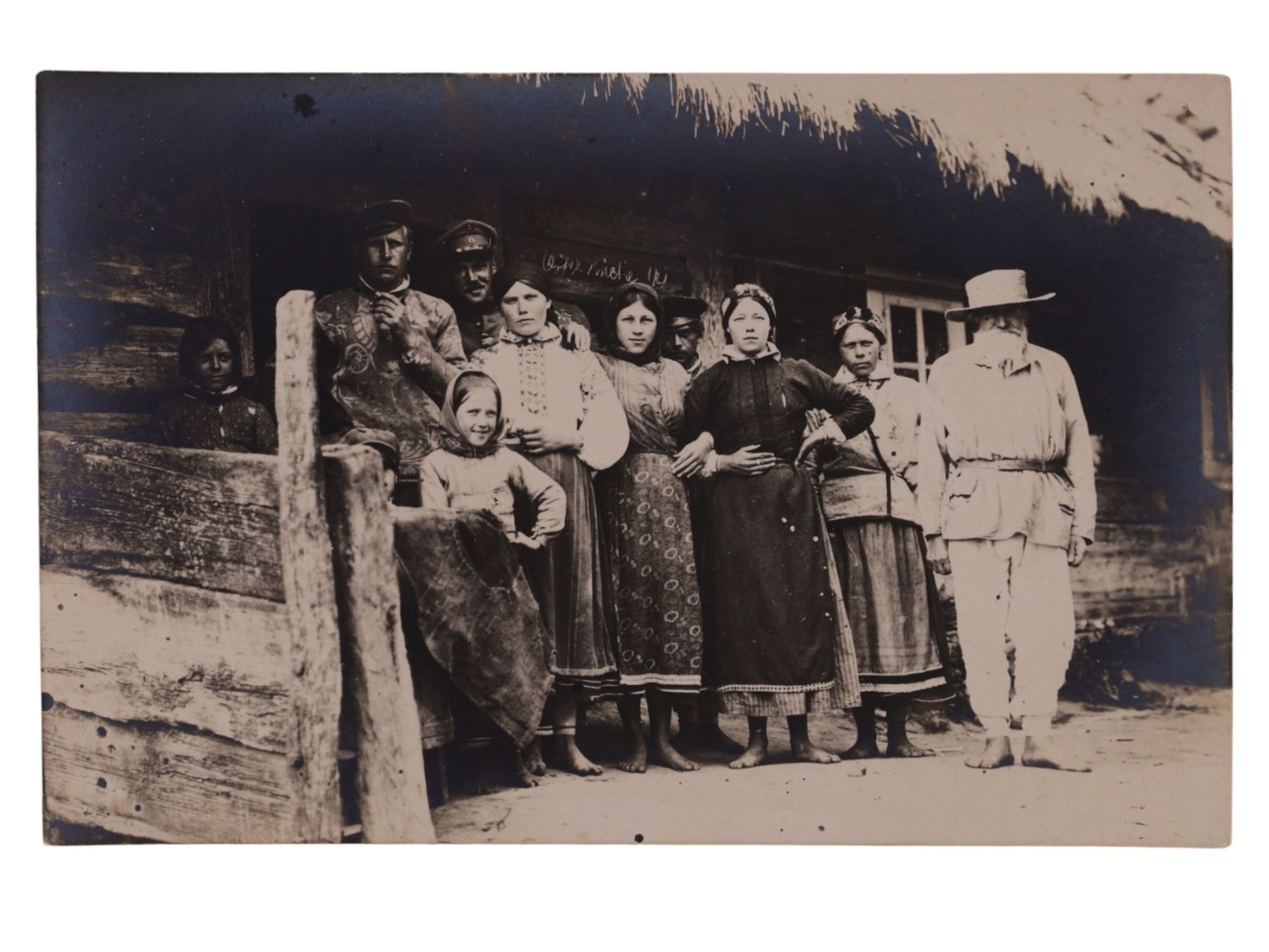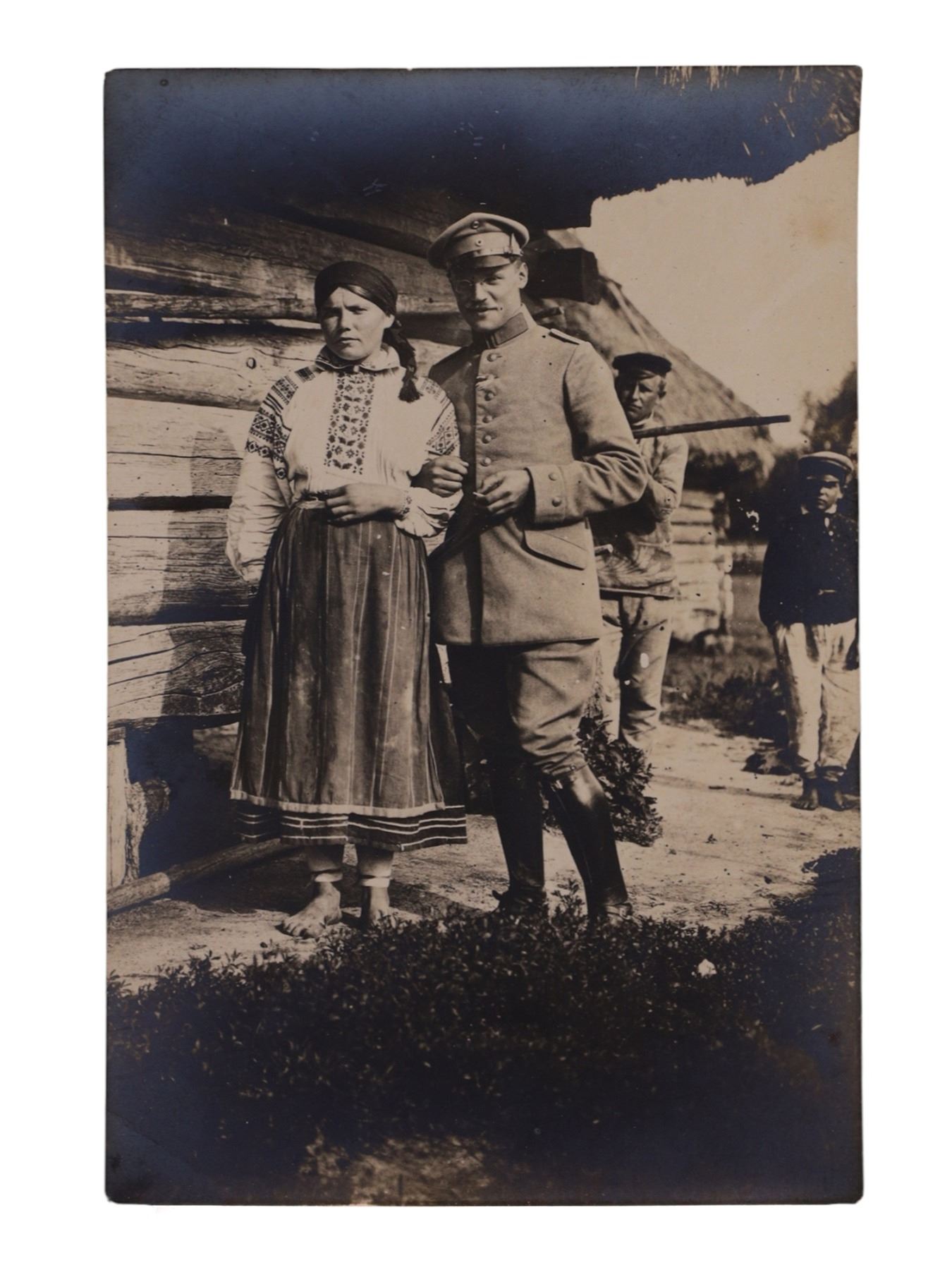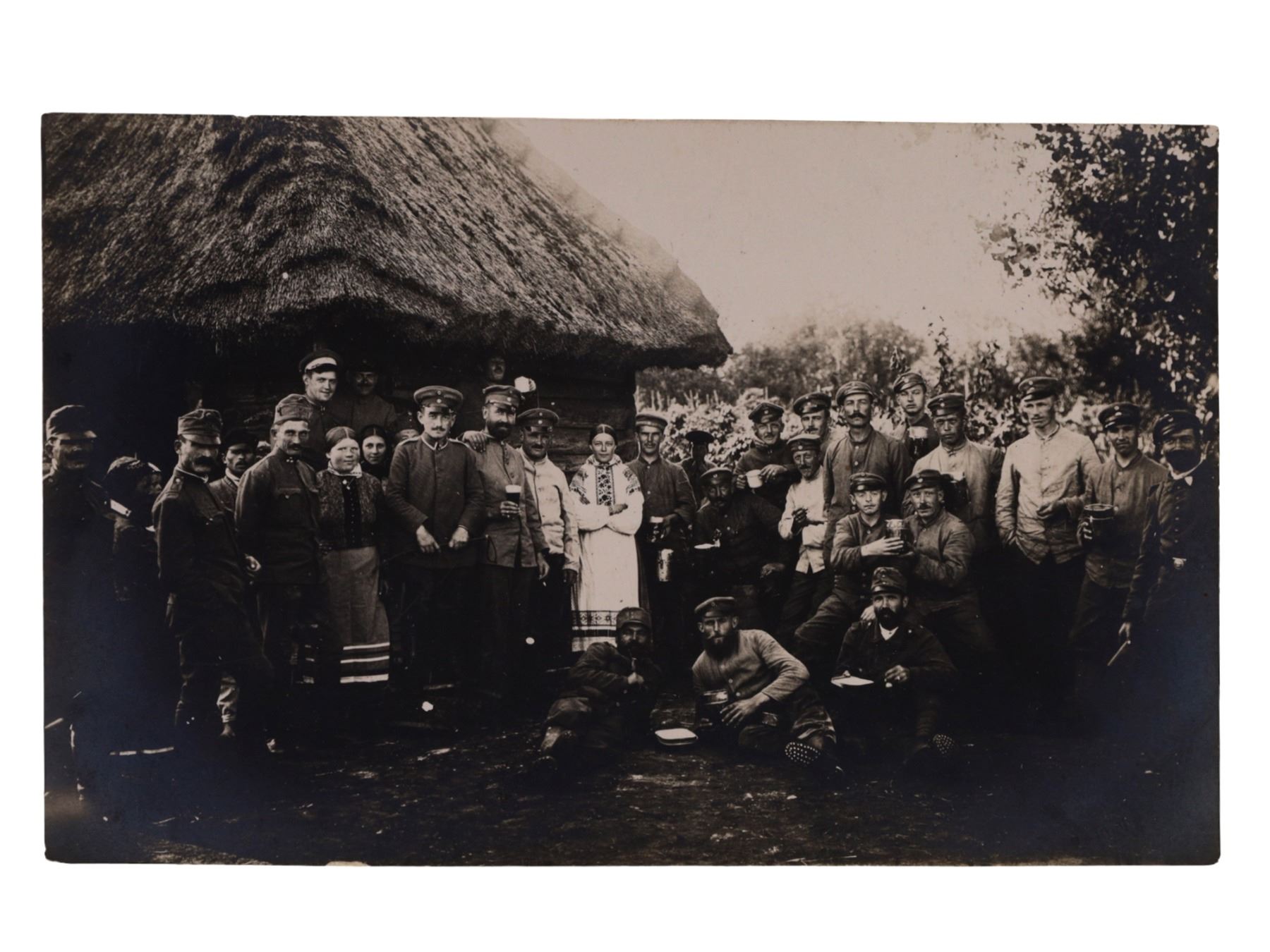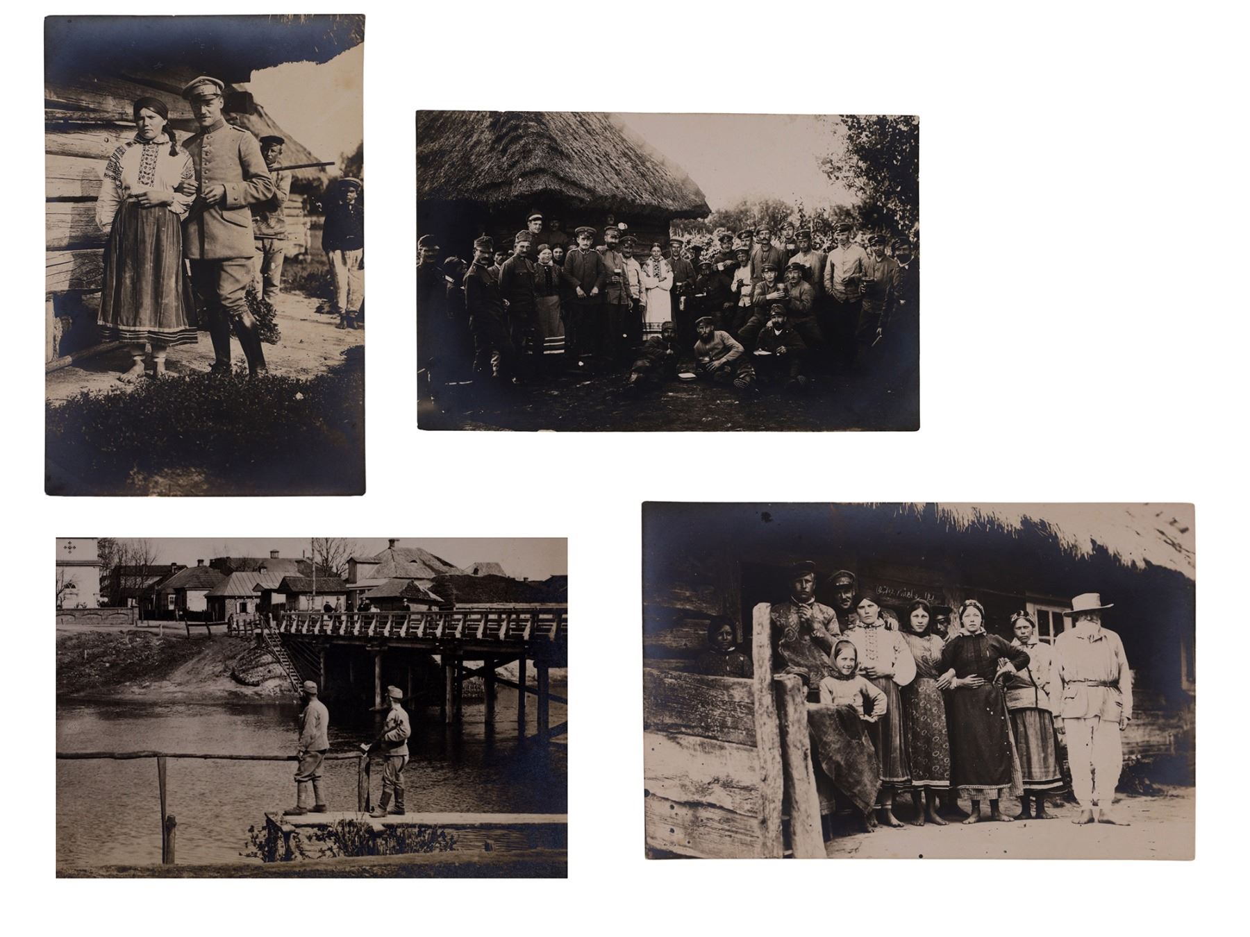A group of five interesting photos from Eastern Poland during WW1 in which can be seen soldiers posing with various villagers and their families, the villagers being barefoot and wearing their traditional dress. The final photo is of a more urbanized settlement with a church by a river.