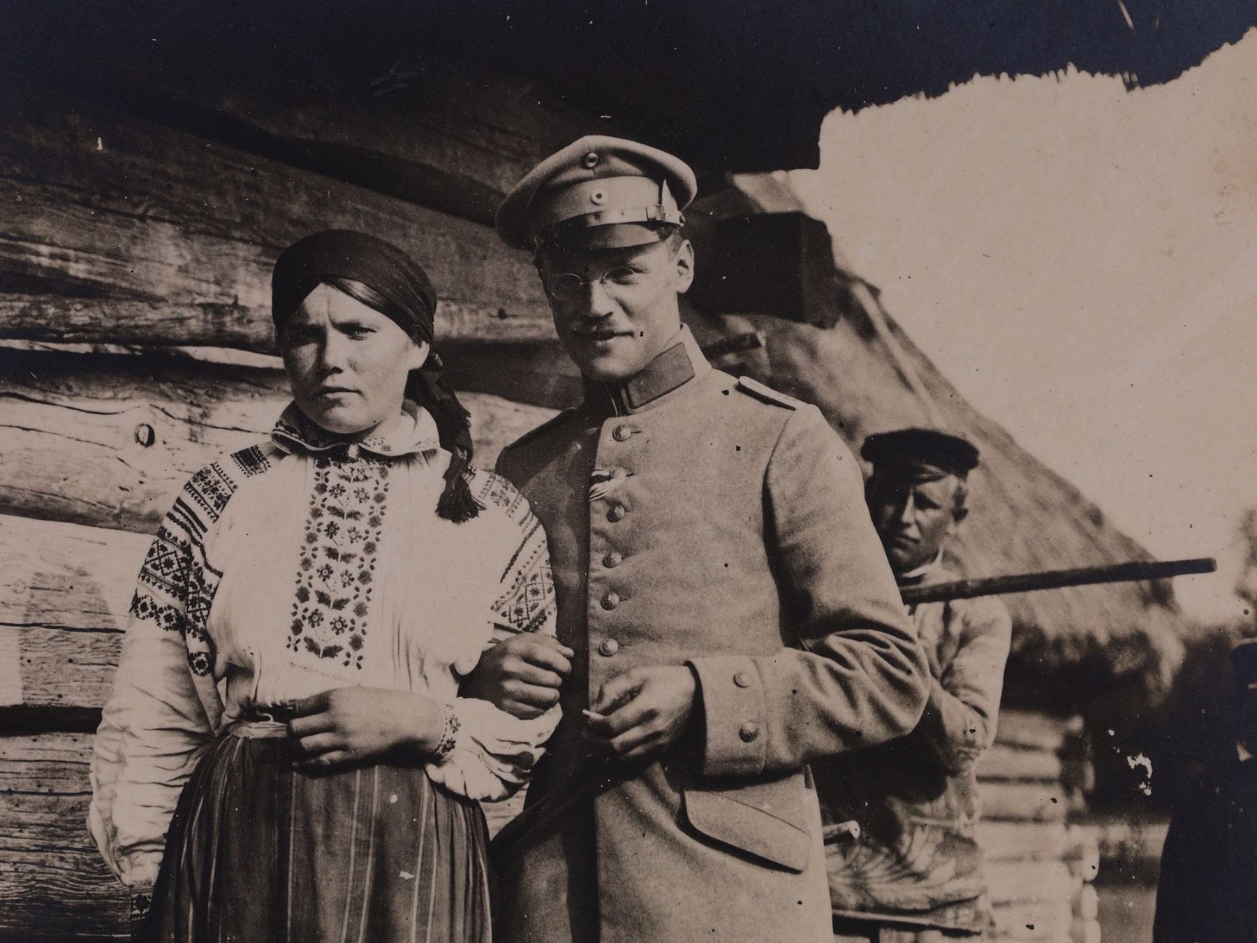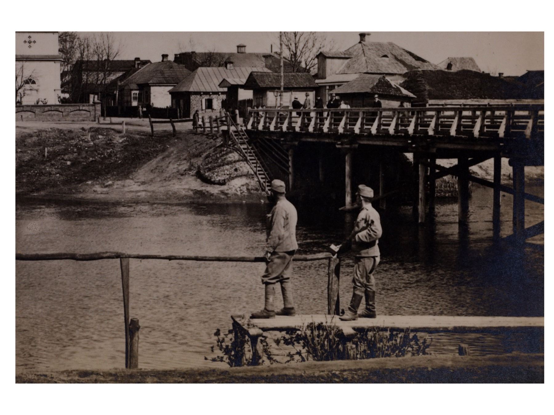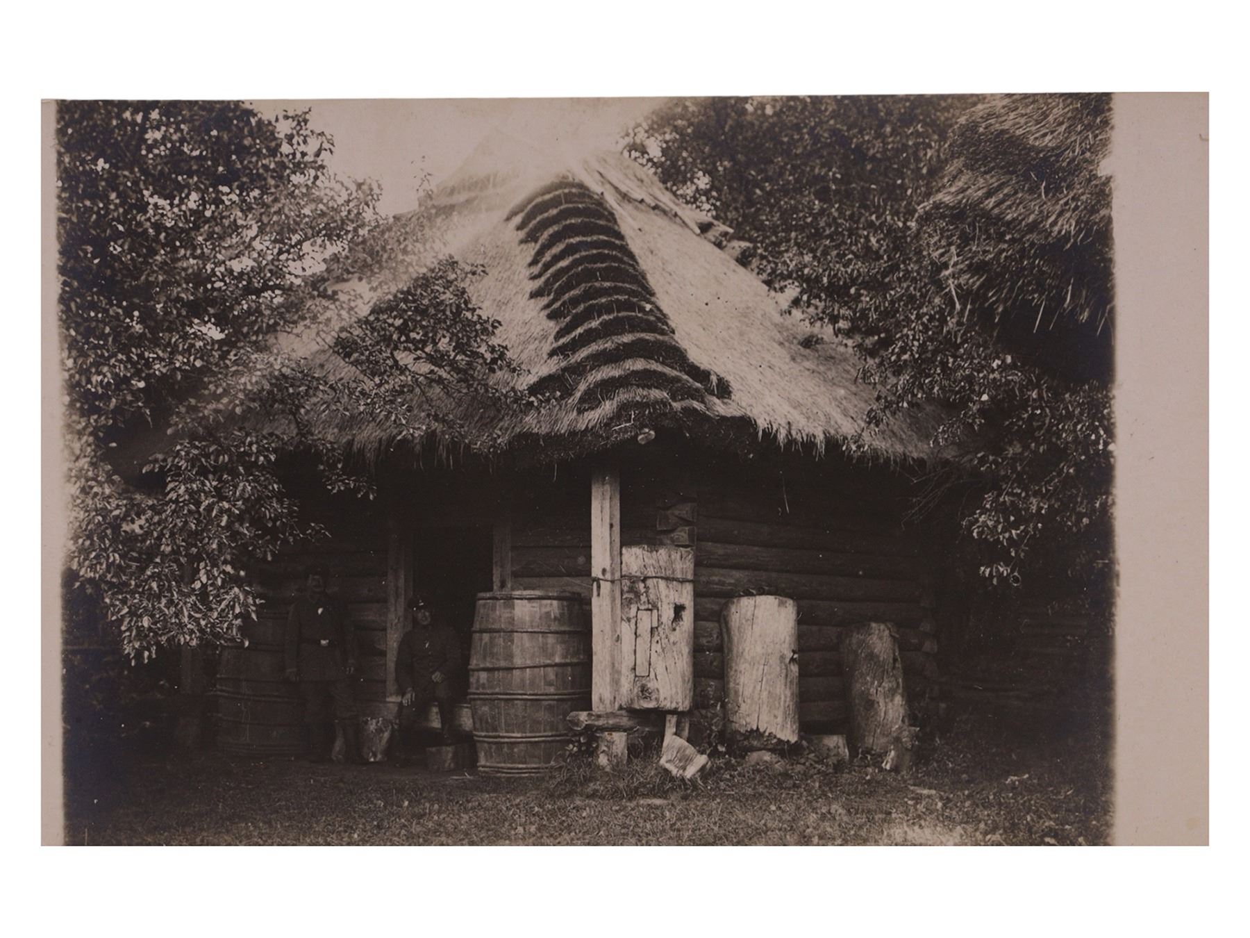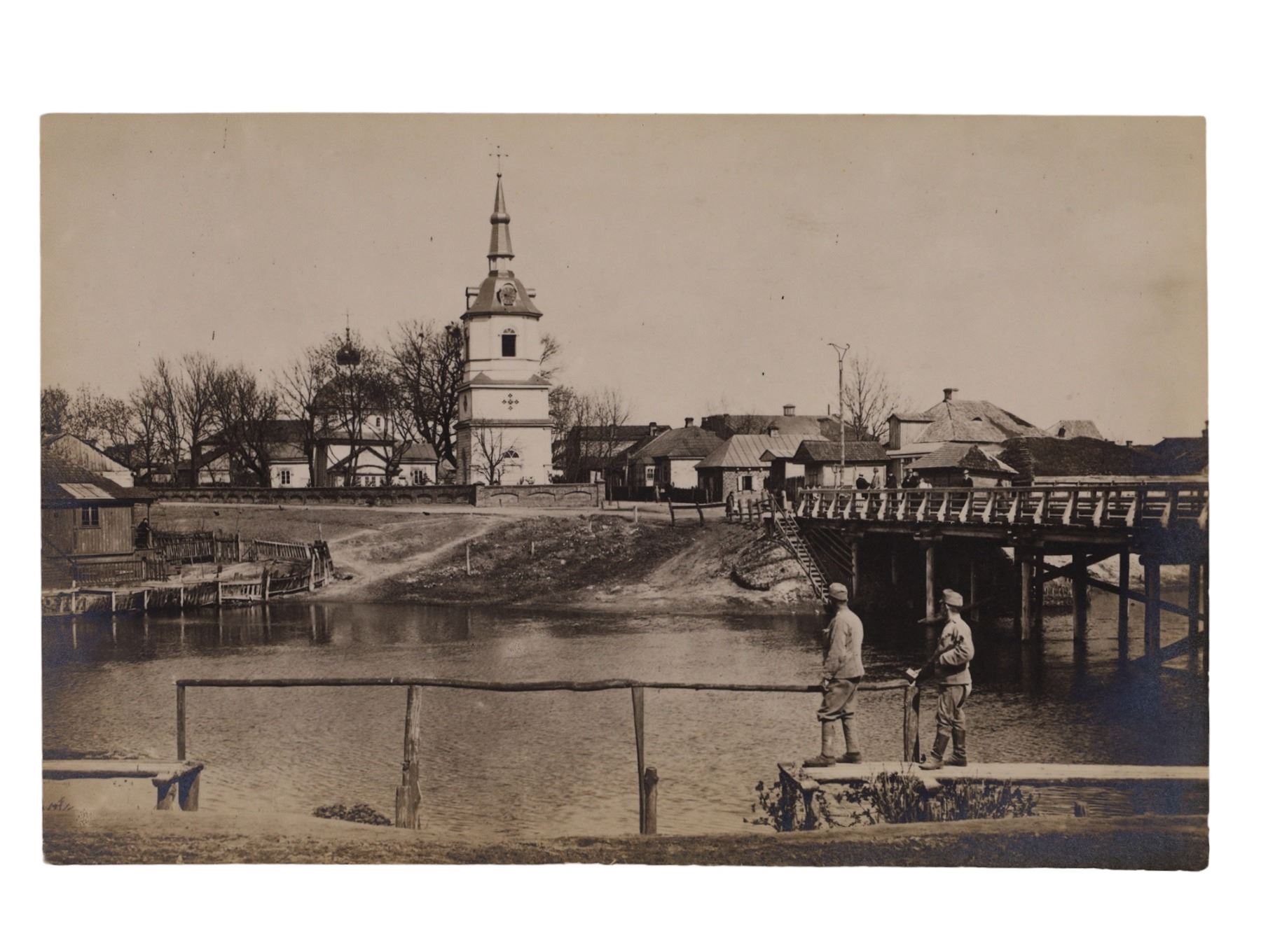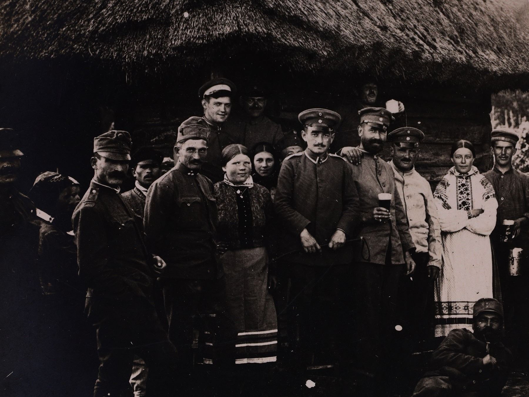A group of five interesting photos from Eastern Poland during WW1 in which can be seen soldiers posing with various villagers and their families, the villagers being barefoot and wearing their traditional dress. The final photo is of a more urbanized settlement with a church by a river.