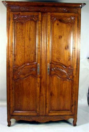 A LOUIS XV CARVED ARMOIRE; the cornice above a flower-carved frieze, paneled doors and similarly decorated apron, all on shaped feet (various repairs) 7'3"h x 4'8"w x 22"d