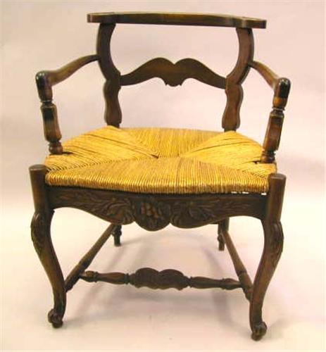 A LOUIS XV PROVINCIAL STYLE CARVED WALNUT LOWBACK, RUSH SEAT FAUTEUIL; Decorated with flowers, leaves and scrolled toes