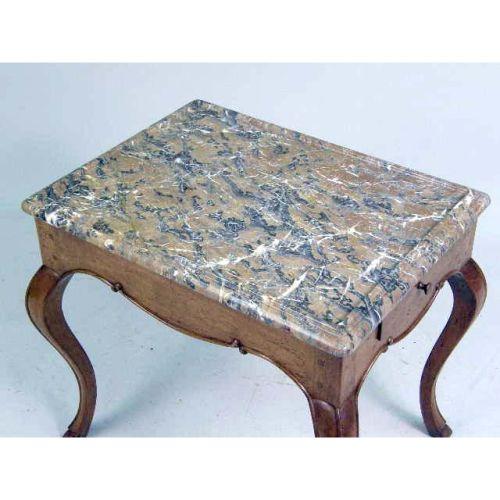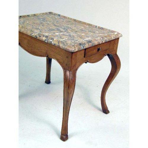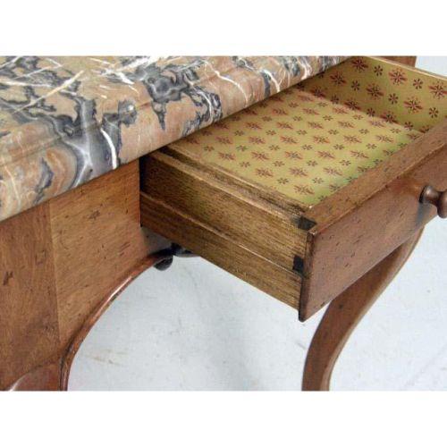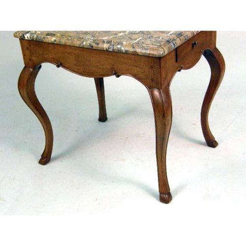 A LOUIS XV PROVINCIAL STYLE MARBLE-TOP WALNUT SIDE TABLE<BR><BR>With a single frieze drawer and angular cabriole legs, 25-1/2"h x 27-1/2"l