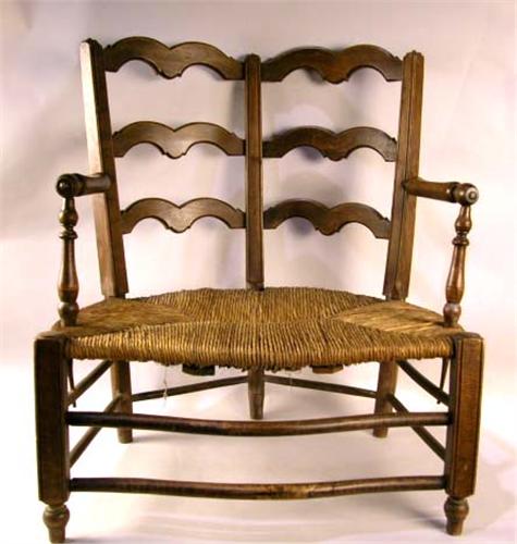 A LOUIS XV STYLE BEECHWOOD DOUBLE CHAIRBACK RUSH SEAT SETTEE; with shaped ladder backs, turned arms and stacked box stretchers.