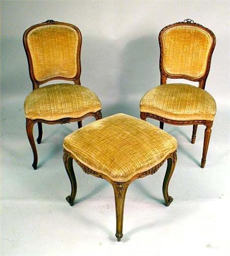 Together with a similarly carved Louis XV style stool and a Louis XVI style side chair. Varying degrees of condition. 3 pieces.