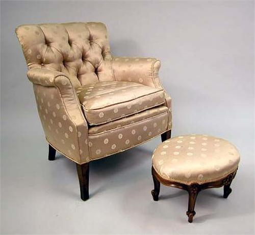A LOUIS XV STYLE CARVED OVAL FOOTSTOOL; The semi-overupholstered top above a conforming leaf-scroll-and floral carved frieze ending on cabriole legs, Together with an identically upholstered club chair, both worn, 2 pieces