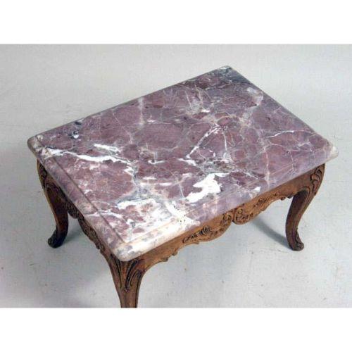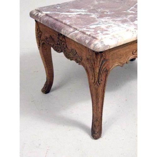 A LOUIS XV STYLE CARVED WALNUT LOW TABLE<BR><BR>With a marble top, the frieze carved with trailing foliage and raised on cabriole legs, 14-1/2"h x 23"l