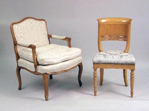<B>A LOUIS XV-STYLE FAUTEUIL</B><BR><BR>Together with a Biedermeier-style side chair. Fauteuil 35"h, Biedermeier 34 1/2"h
