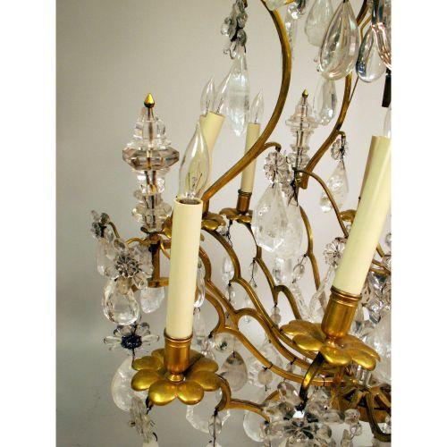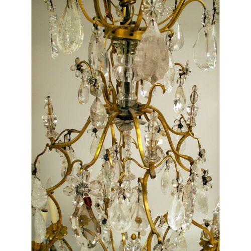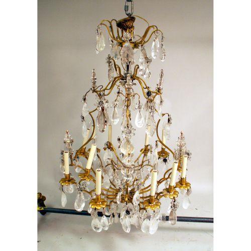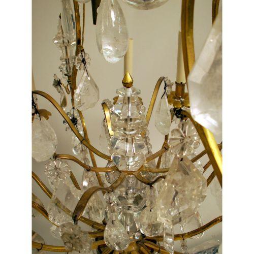 A LOUIS XV STYLE GILT BRONZE AND ROCK CRYSTAL MOUNTED TWELVE LIGHT CHANDELIER<BR><BR>French, electrified. Provenance: Ex-Patino Collection
