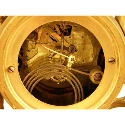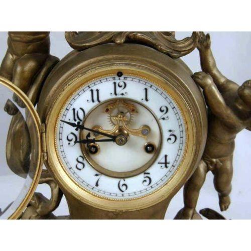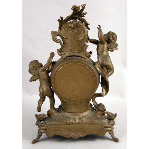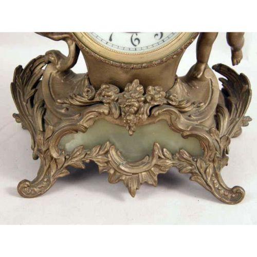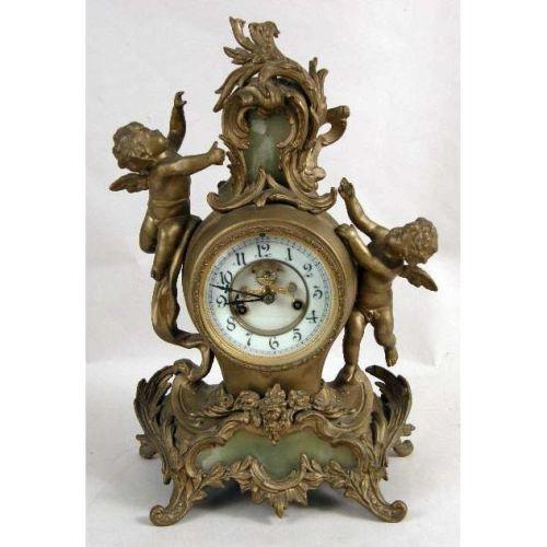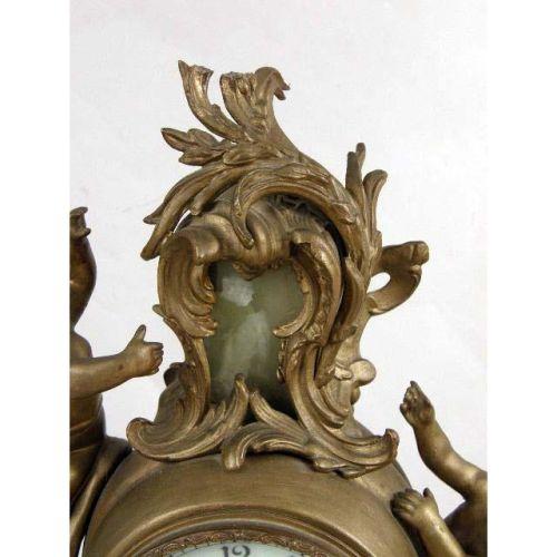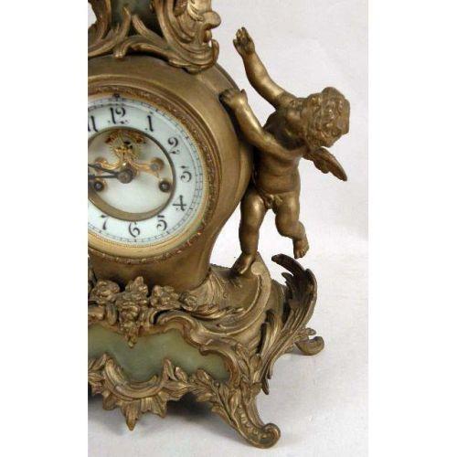 A LOUIS XV STYLE MANTLE CLOCK<BR><BR>Mounted with putti, and inlaid green stone, and enamel dial, 16"h x 10-3/4"w