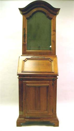 A LOUIS XV STYLE WALNUT DIMINUTIVE SECRETAIRE; in two parts, with a domed mirrored bookcase above a paneled slant-front lid above a cupboard door and bracket feet 6'h x 23"w x 16"d