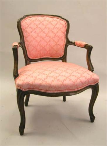 A LOUIS XV STYLE WALNUT FAUTEUIL; Covered in pink upholstery