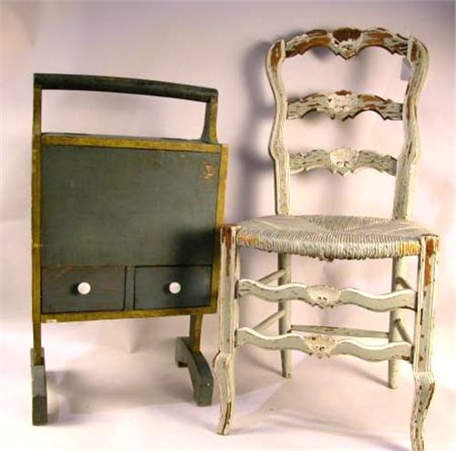 A LOUIS XV STYLE WHITE-PAINTED CARVED OAK SIDE CHAIR; together with a green painted storage cabinet with shoe feet.