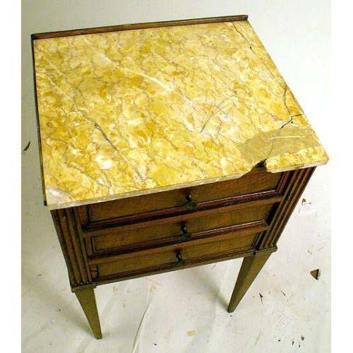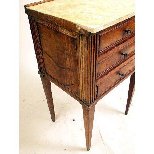 A LOUIS XVI MARBLE TOP WALNUT CHIFFONIER<BR><BR>French. Marble top replaced, repairs, losses. 30"h x 17"w x 14 1/2"d.