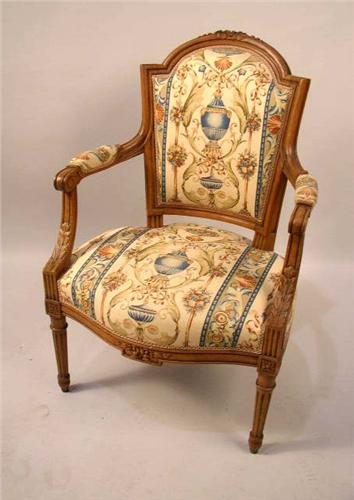 A LOUIS XVI STYLE CARVED BEECHWOOD FAUTEUIL; With a bow-knot crest and leaf-carved decoration on fluted legs