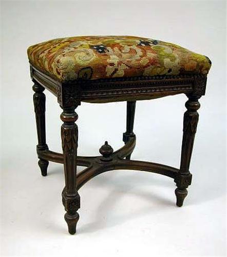 A LOUIS XVI STYLE CARVED MAHOGANY AND NEEDLEWORK UPHOLSTERED STOOL; The rectangular seat above a conforming egg-and-dart carved frieze, supported on tear carved turned tapering fluted legs joined by an x-shaped stretcher surmounted by a turned finial, 21"h x 17"w x 17"