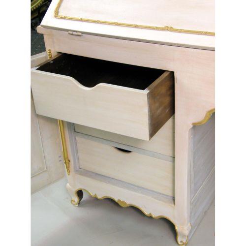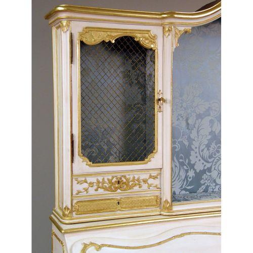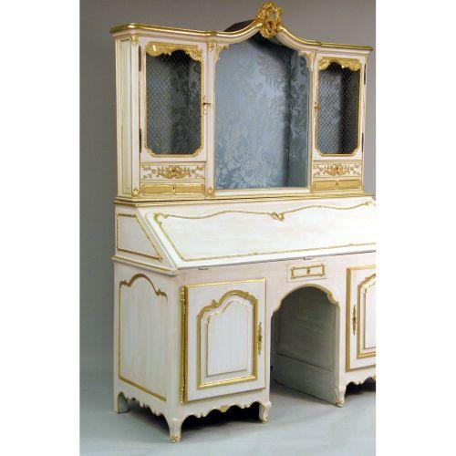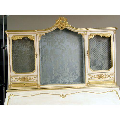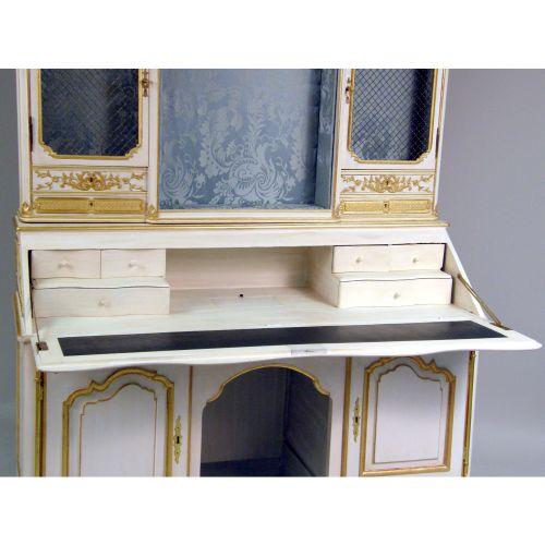 A LOUIS XVI STYLE CREAM AND GILT-DECORATED BUREAU CABINET<BR><BR>The upper section with an open shelf at the center flanked by grillwork cupboards and drawers, the lower section with a slant front enclosing an interior fitted with drawers and a leather-lined writing surface, approximately 6`h x 5`w