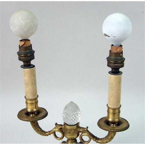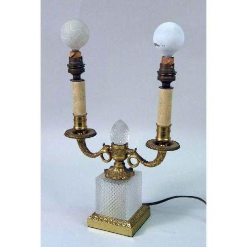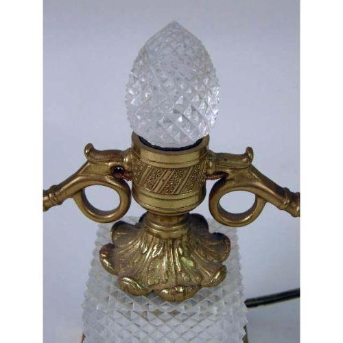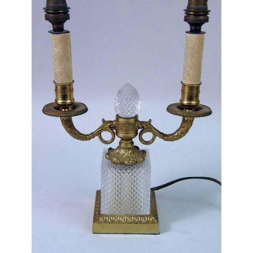 A LOUIS XVI STYLE CUT-GLASS AND GILT-METAL TWO-BRANCH CANDLESTICK-FORM LAMP<BR><BR>17-1/2"h
