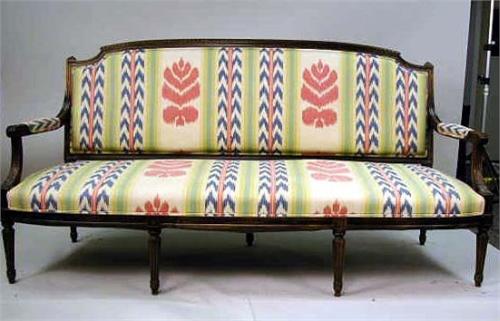 A LOUIS XVI STYLE MAHOGANIZED SETTEE; With a gadrooned crest, leaf carved arms and fluted legs 6'2"l