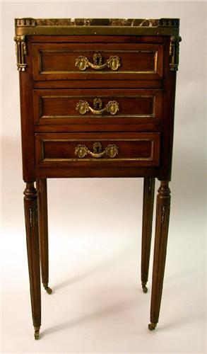 A LOUIS XVI STYLE MARBLE TOP FRUITWOOD CHIFFONNIERE; With three-quarter brass, short drawers and fluted legs, 32-1/4"h x 14"w x 10-1/2"d, Prov: Sotheby's, sale 1489, lot 149, December 20-21, 1994