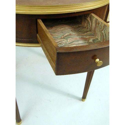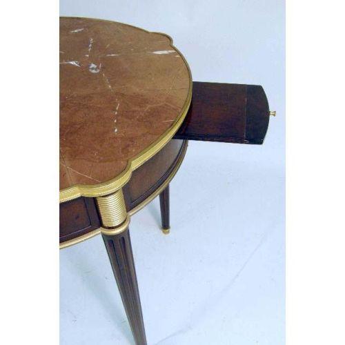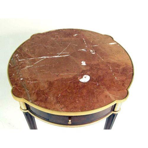 A LOUIS XVI STYLE MARBLE-TOP MAHOGANY STAINED BOUILLOTTE TABLE<BR><BR>With a lobed frieze with a drawer on two sides, raised on turned tapered fluted legs, 30"h x 28"w