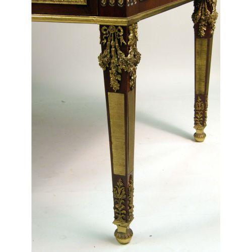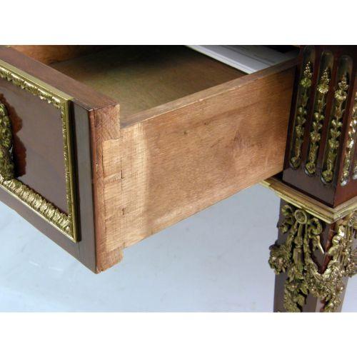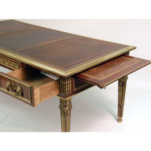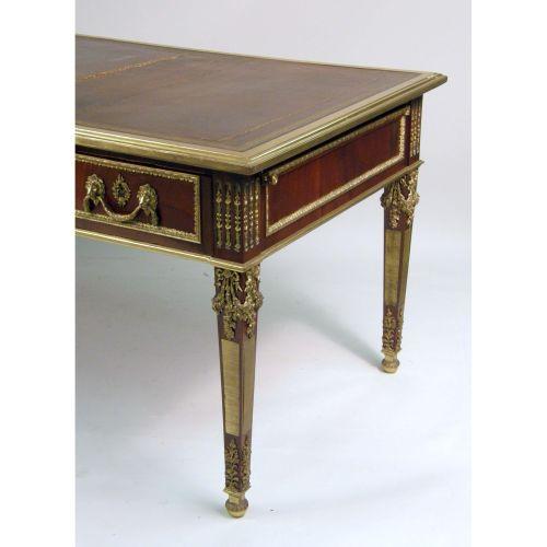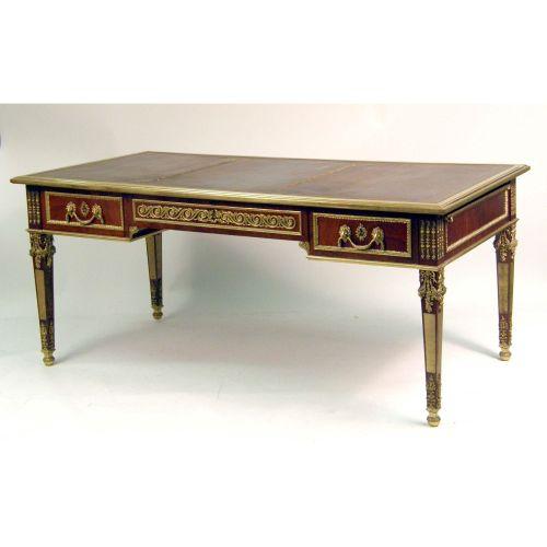 A LOUIS XVI STYLE ORMOLU-MOUNTED MAHOGANY BUREAU PLAT<BR><BR>The rectangular top inset with a panel of gilt-tooled black leather with a brass molded edge, the frieze with three drawers, 30-1/2"h x 6`l