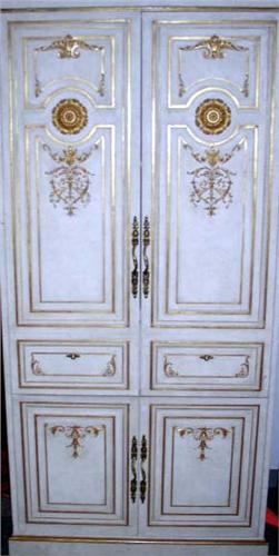 A LOUIS XVI STYLE WHITE-PAINTED AND PARCEL-GILT CABINET; With an overhanging cornice above paneled doors opening to shelves and drawers, 7'10"h x 4'w x 25"d, some wear
