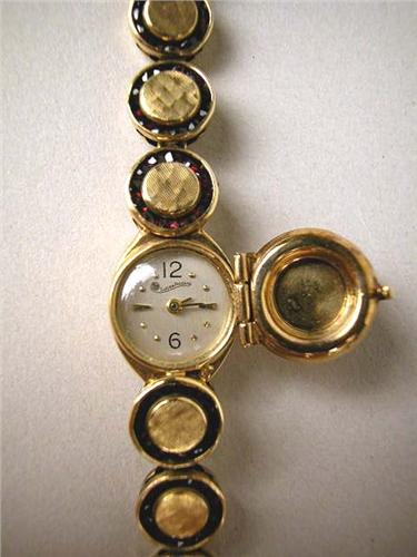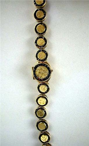 A LUCIEN PICARD 14K YELLOW GOLD WATCH With multiple circles with outer garnet and inner gold, apx. 1