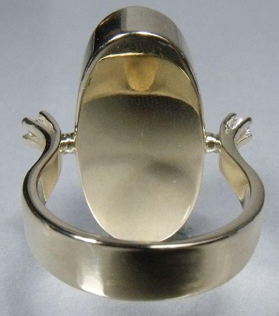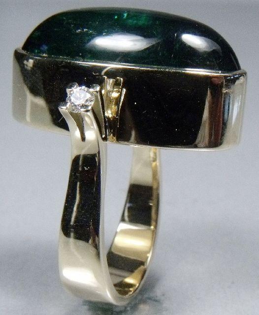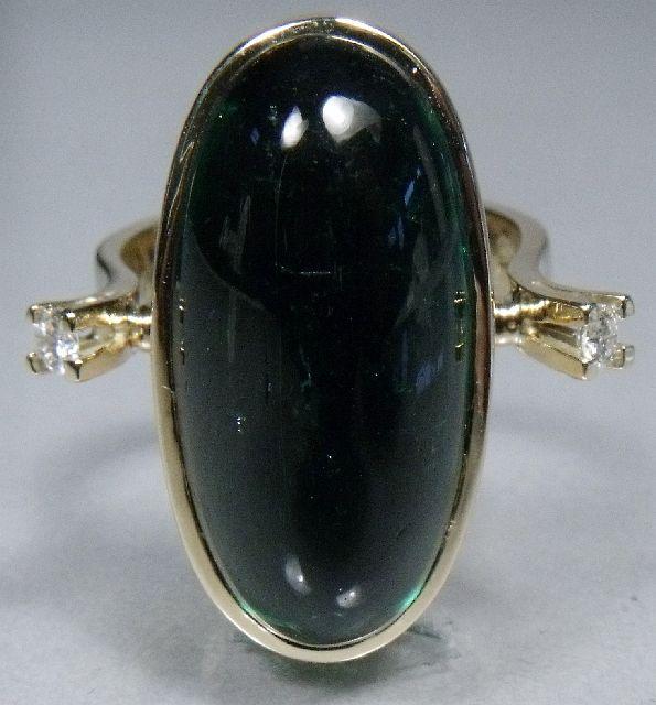 A Ladies 14 kt Yellow Gold, Diamond and Tourmaline Ring, Ring is set with 1 green tourmaline measuring approximately 22 mm x 10 mm. Ring is additionally set with 2 brilliant cut diamond melee weighing approximately 0.05 cts each or 0.10 cts total. Size: 6