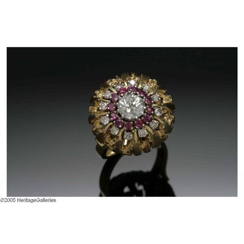 <B>A Ladies 14K Yellow Gold Fashion Ring Centered With An Old European Cut Diamond And Rubies</B></I><BR><BR>The band weighing 14.0 gms centered with a diamond weighing .98 Cts. (estimated); Clarity: I-1; Color: I - J along with melee of 12 round full cut diamonds weighing 0.02 Cts. each, total weight .024 Cts. (estimated); Clarity: SI-1 - I-1; Color: I-J and melee of 12 round faceted rubies weighing 0.05 Cts. each, total weight 0.60 Cts. (estimated); Clarity: Heavily included (H1)<BR><BR><I>Accompanied by a G.I.A. Graduate Gemologist appraisal.</B></I>