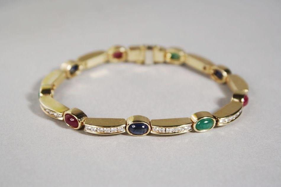 A Ladies 18 kt Yellow Gold, Ruby, Sapphire and Emerald Segmented Line Bracelet, Comprising of 3 natural bezel set cabochon rubies, sapphires and emeralds, nine gem stones total. Each bezel separated by 6 diamond melee, approximately 54 diamonds, total weight 2 cts, penny weight 13.5. length: 7 in