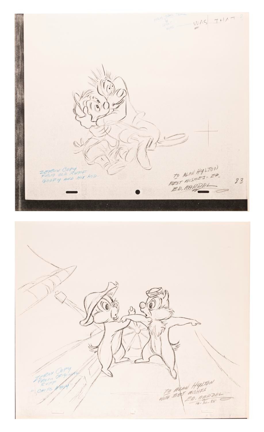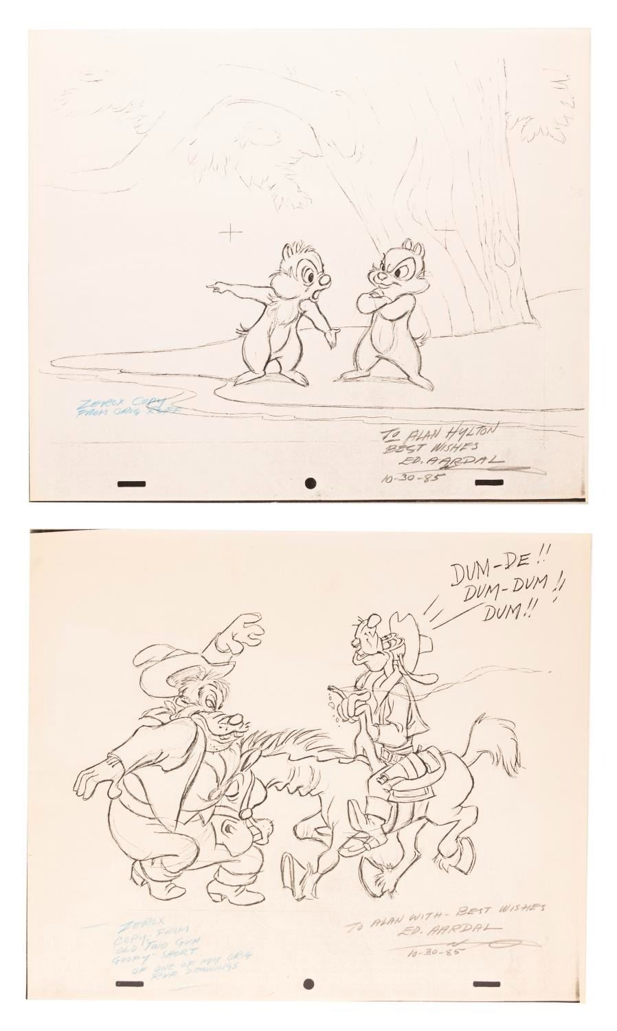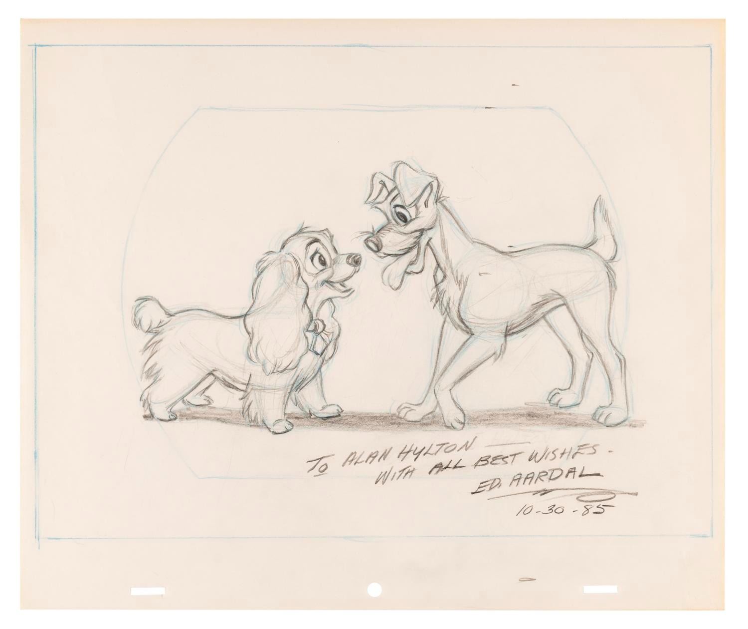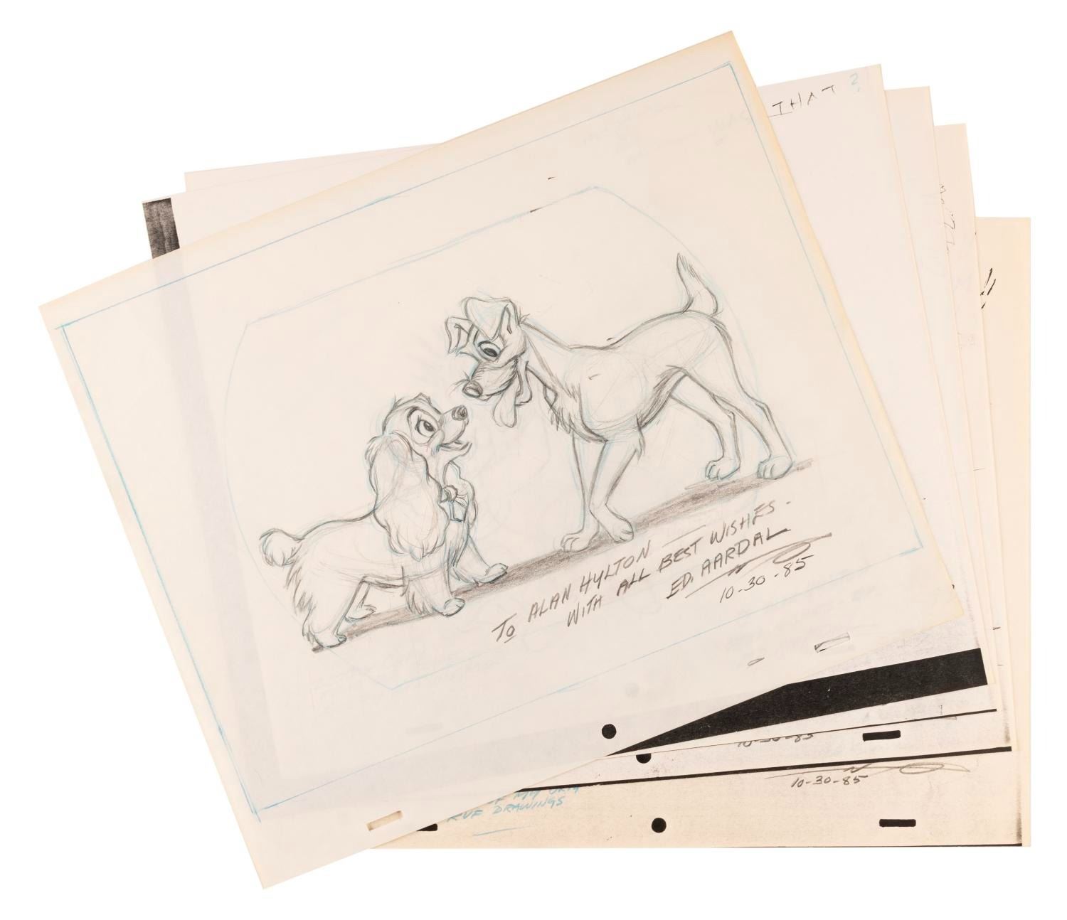 (Disney, 1980s) An original "Lady and the Tramp" drawing signed by character animator Edwin Aardal. Included are signed xeroxes of Aardal’s drawings for four Disney shorts. Each measuring 10.5" x 12.5", the drawing and xeroxes are in fine condition.