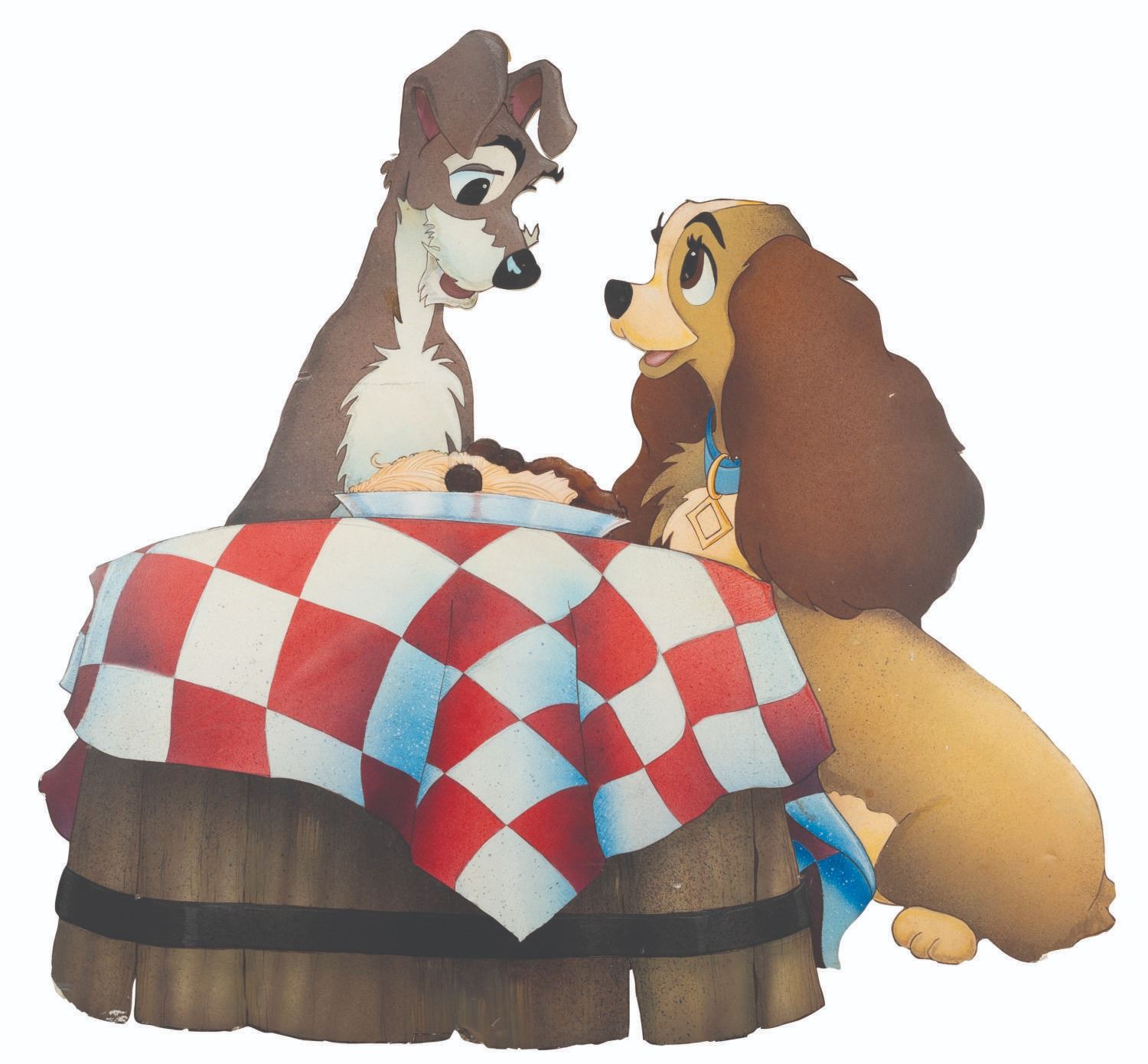 (Disney, 1990s-2000s) A large store display recreating the tender Bella Notte sequence from “Lady and the Tramp.” Measuring 46” x 48.5”, the foam board sign displays in good condition with spots of discoloration, scratches, small dents, scrapes including a 1.75” one on the far right, and wear from age and use.