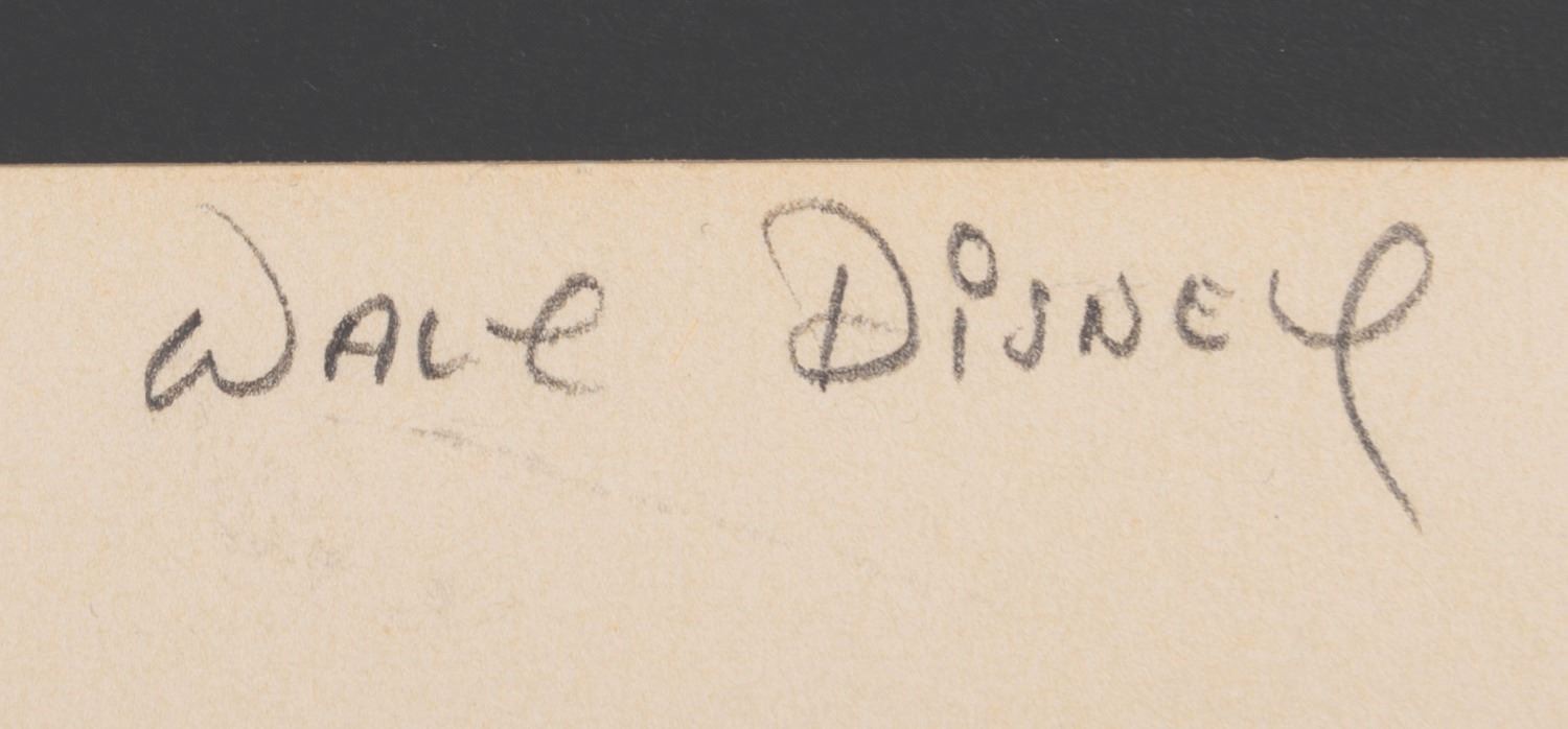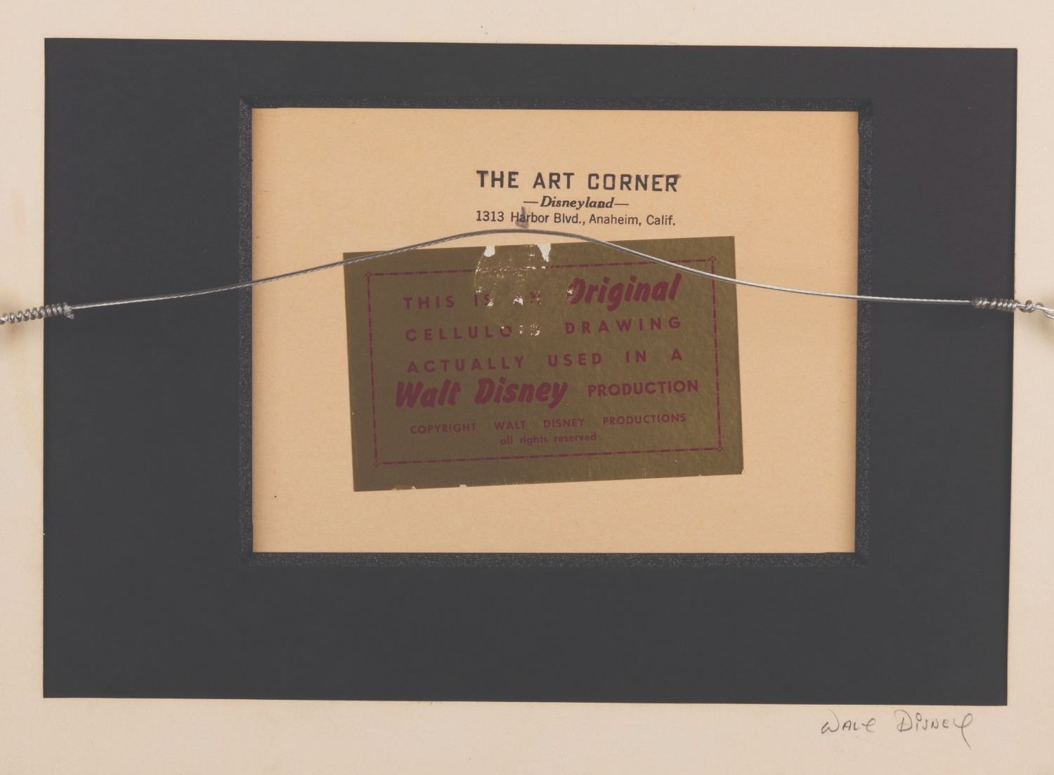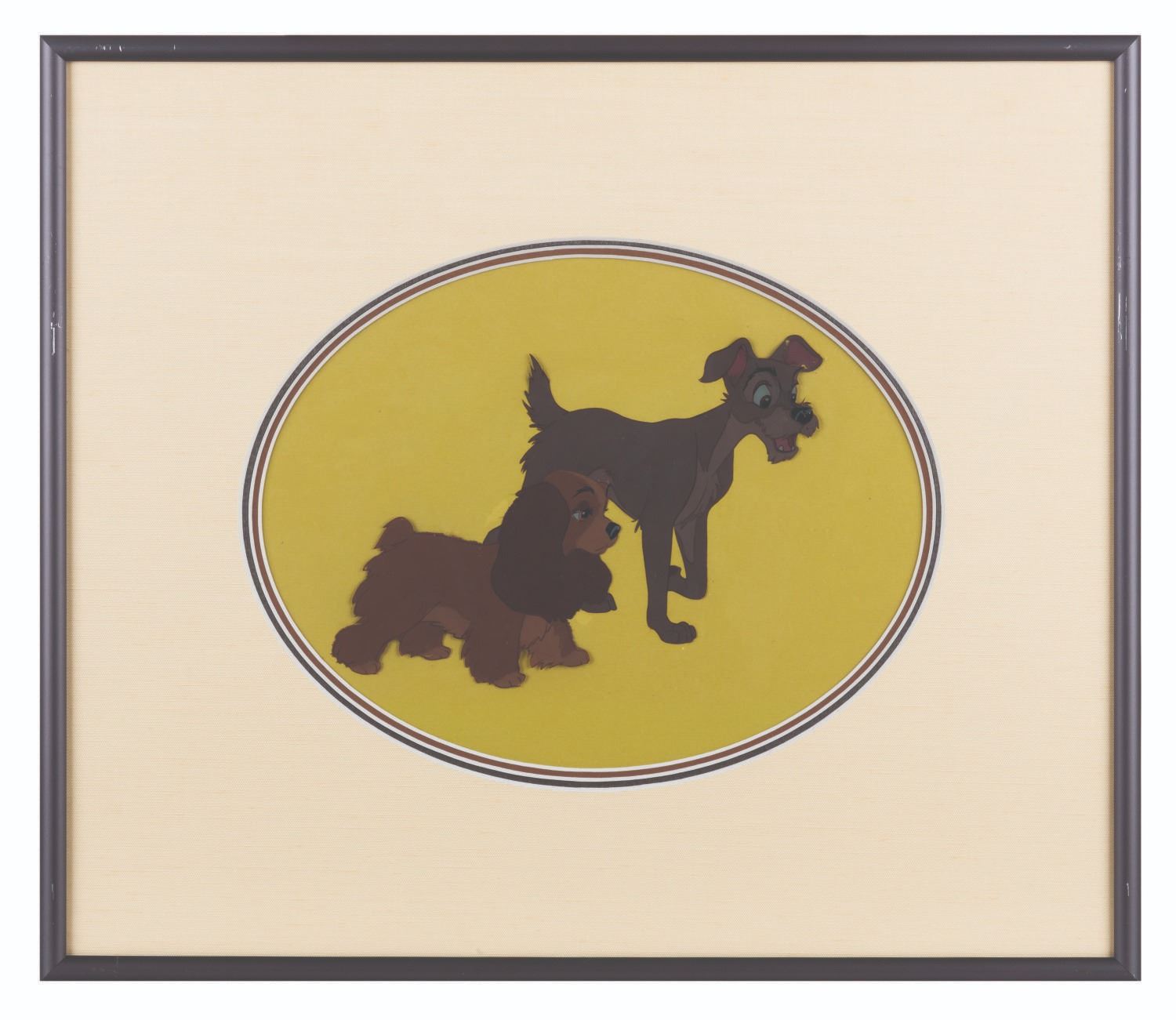 (Disney, 1955) An original production cel from "Lady and the Tramp.” This cel was sold at the Disneyland Art Corner, and comes with the original Art Corner gold label on the back of the frame. Lady and Tramp have an image size of 5” x 7” on a 7” x 9” visible cel. The entire framed and matted piece measures 13” x 15”. The piece displays in very good condition with light paint separation to Tramp’s face and light warping from age.