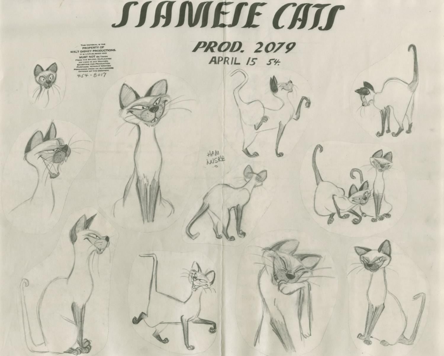 (Disney, 1955) An original photostat model sheet of the Siamese Cats from the feature film "Lady and the Tramp.” Model sheets such as these were distributed to animators and crew working on the film to ensure character design continuity. Measuring 11" x 14", the model sheet is in very good condition with edge and corner wear, creases, rippling, and discoloration from production use and age.