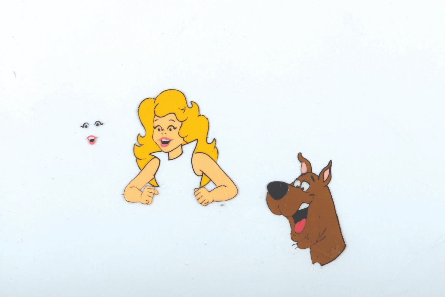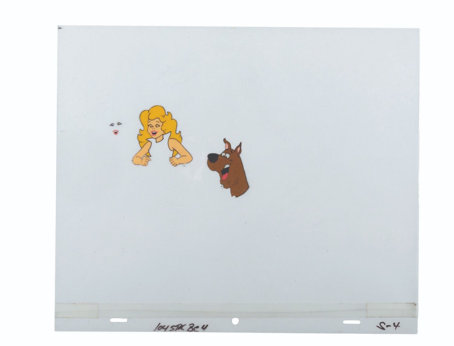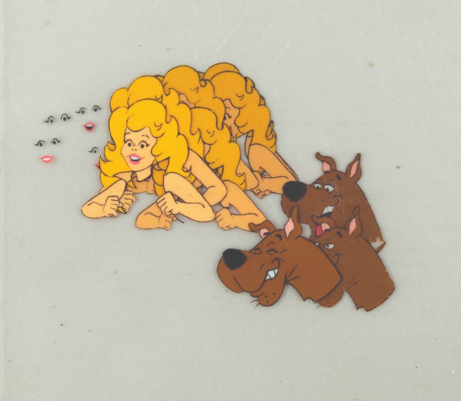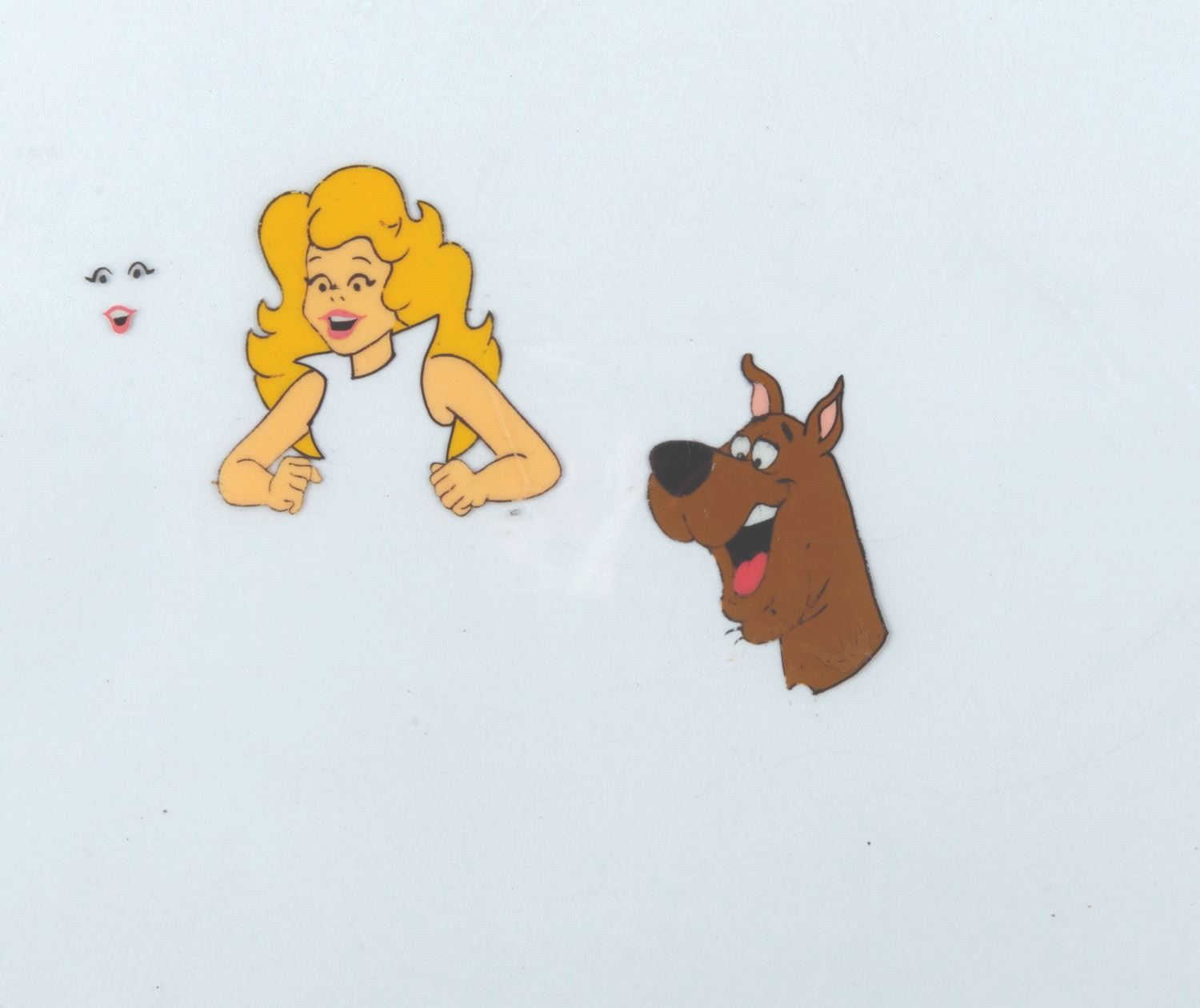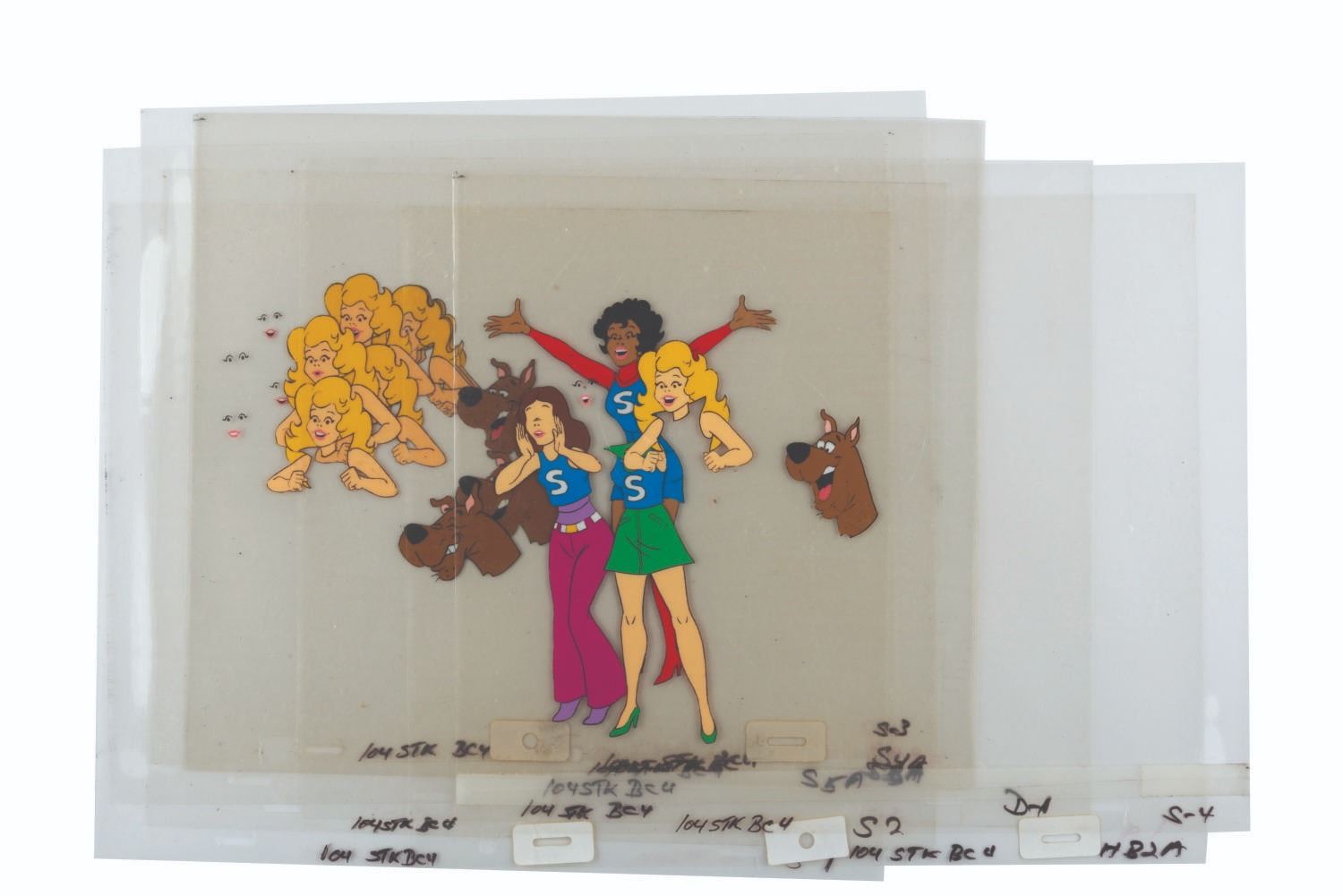 (Hanna-Barbera, 1977-78) A multi-layer cel from"Laff-A-Lympics" of Scooby Doo’s face along with the Teen Angels from Captain Caveman. Included are six extra layers with alternate expressions for Scooby and two of the Angels. With an image size of 6" x 6.25" on 10.5" x 12.5" cels, the piece dislays in very good condition with slight line loss and paint lifting to some layers.
