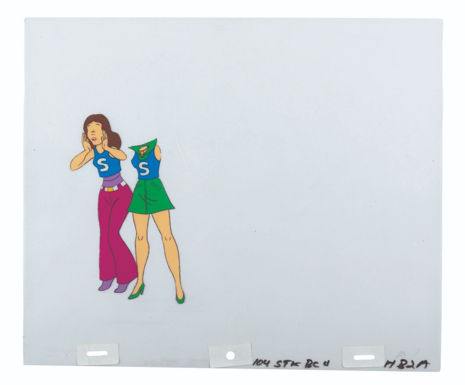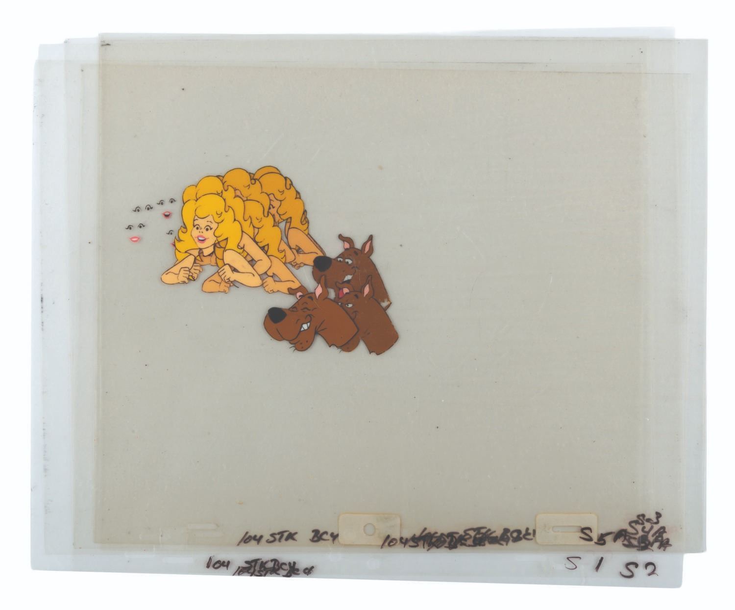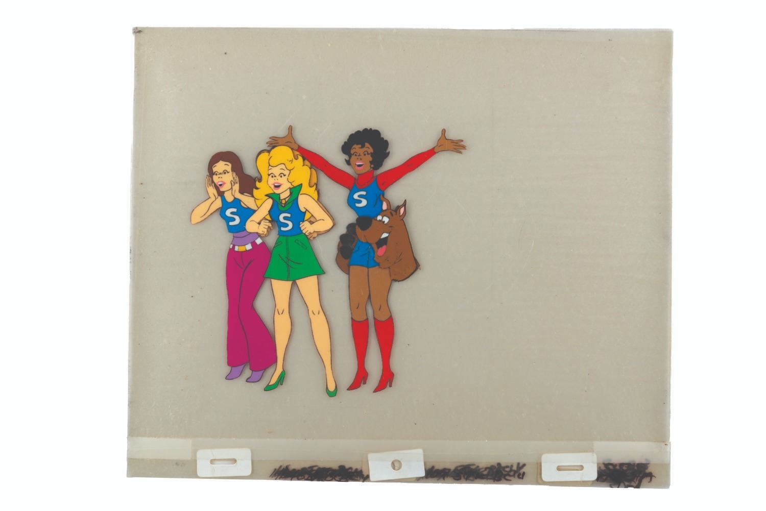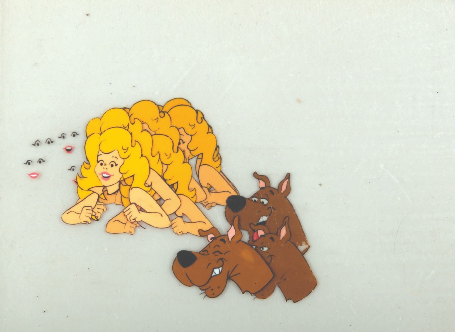 (Hanna-Barbera, 1977-78) A multi-layer cel from"Laff-A-Lympics" of Scooby Doo’s face along with the Teen Angels from Captain Caveman. Included are six extra layers with alternate expressions for Scooby and two of the Angels. With an image size of 6" x 6.25" on 10.5" x 12.5" cels, the piece dislays in very good condition with slight line loss and paint lifting to some layers.