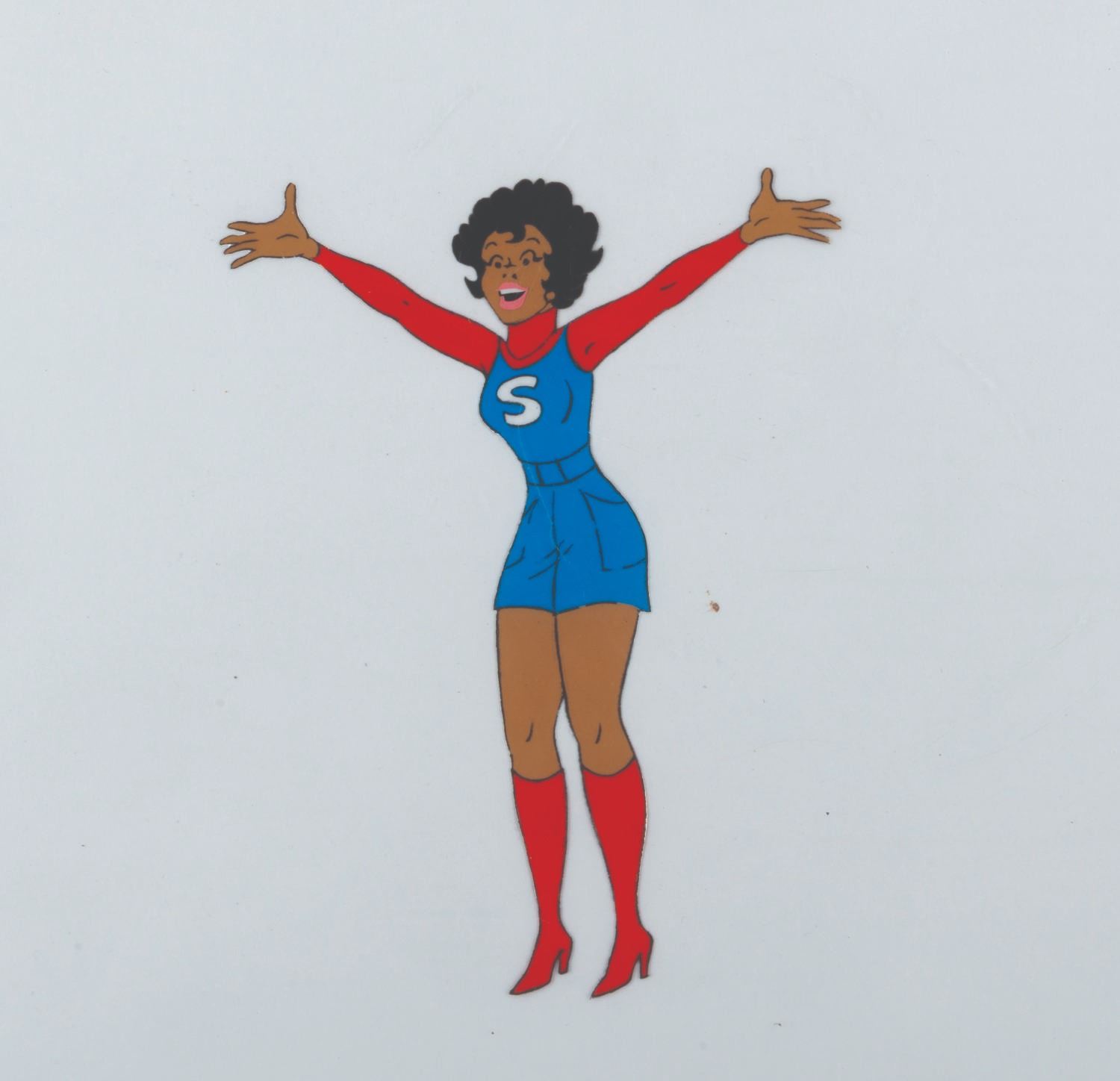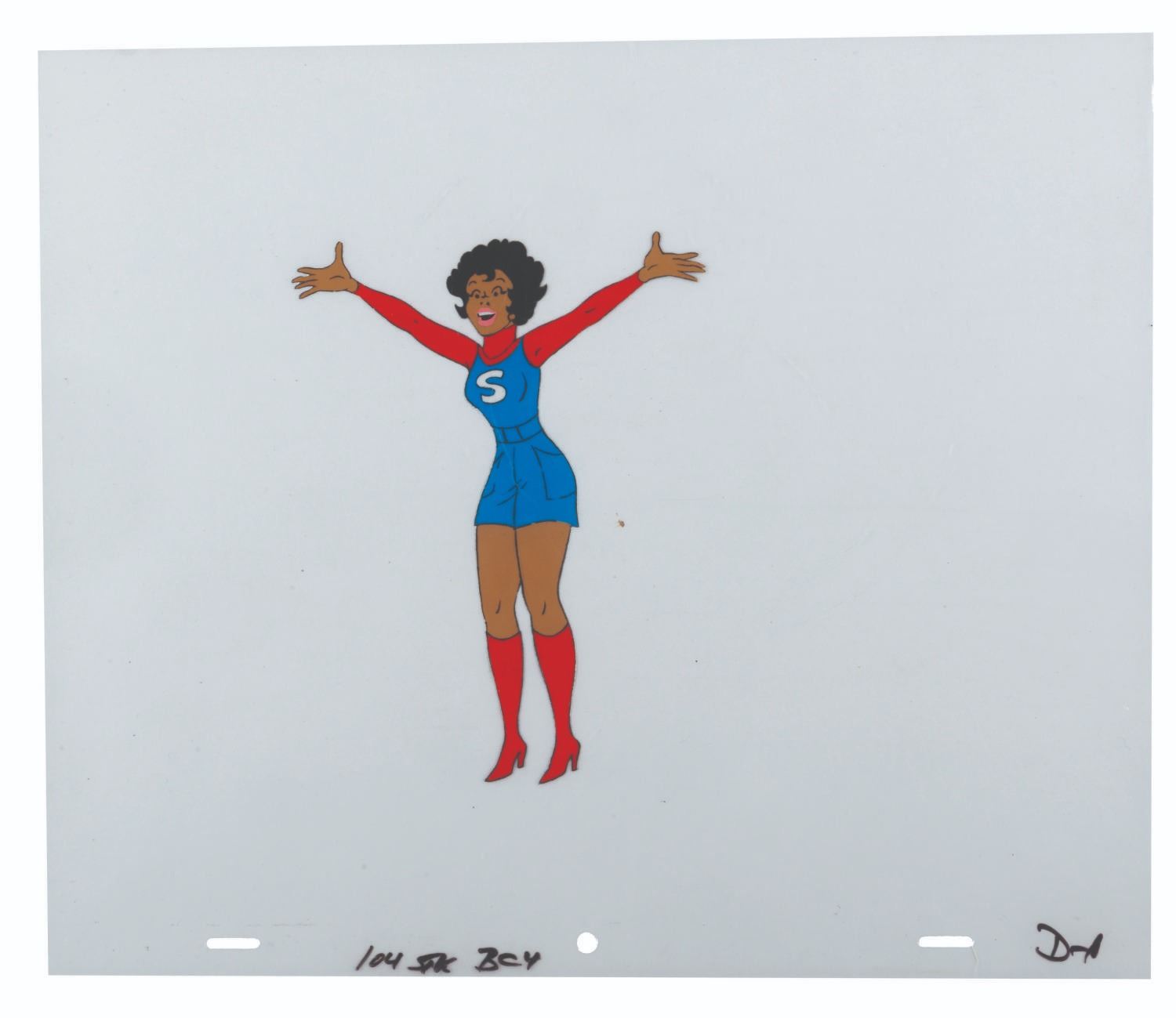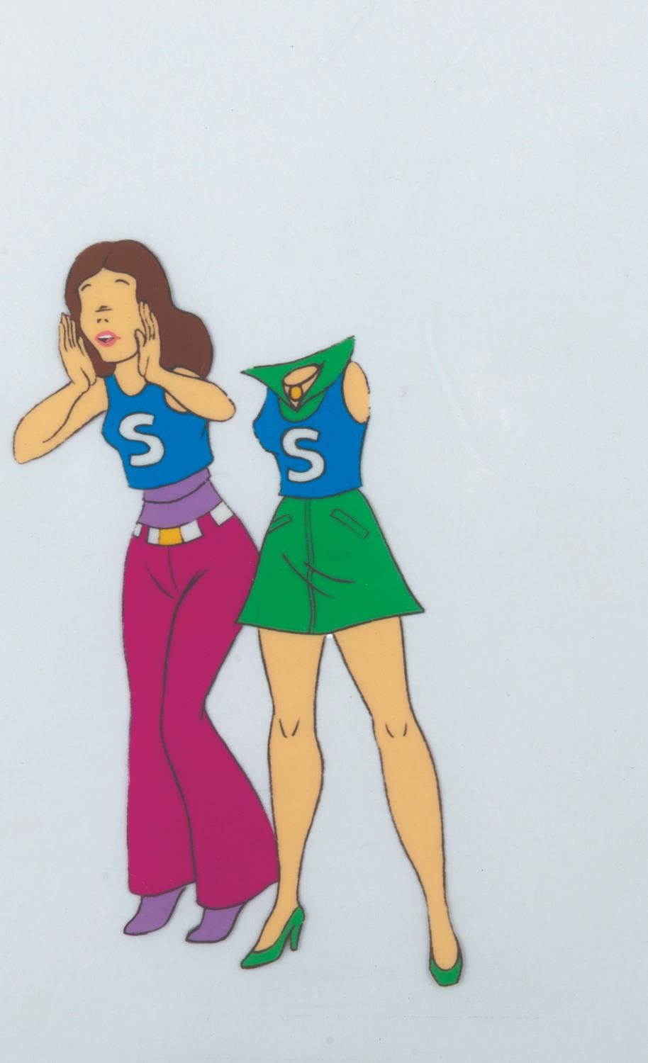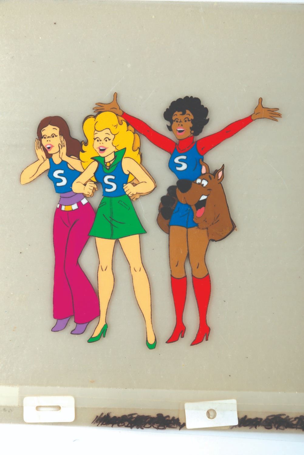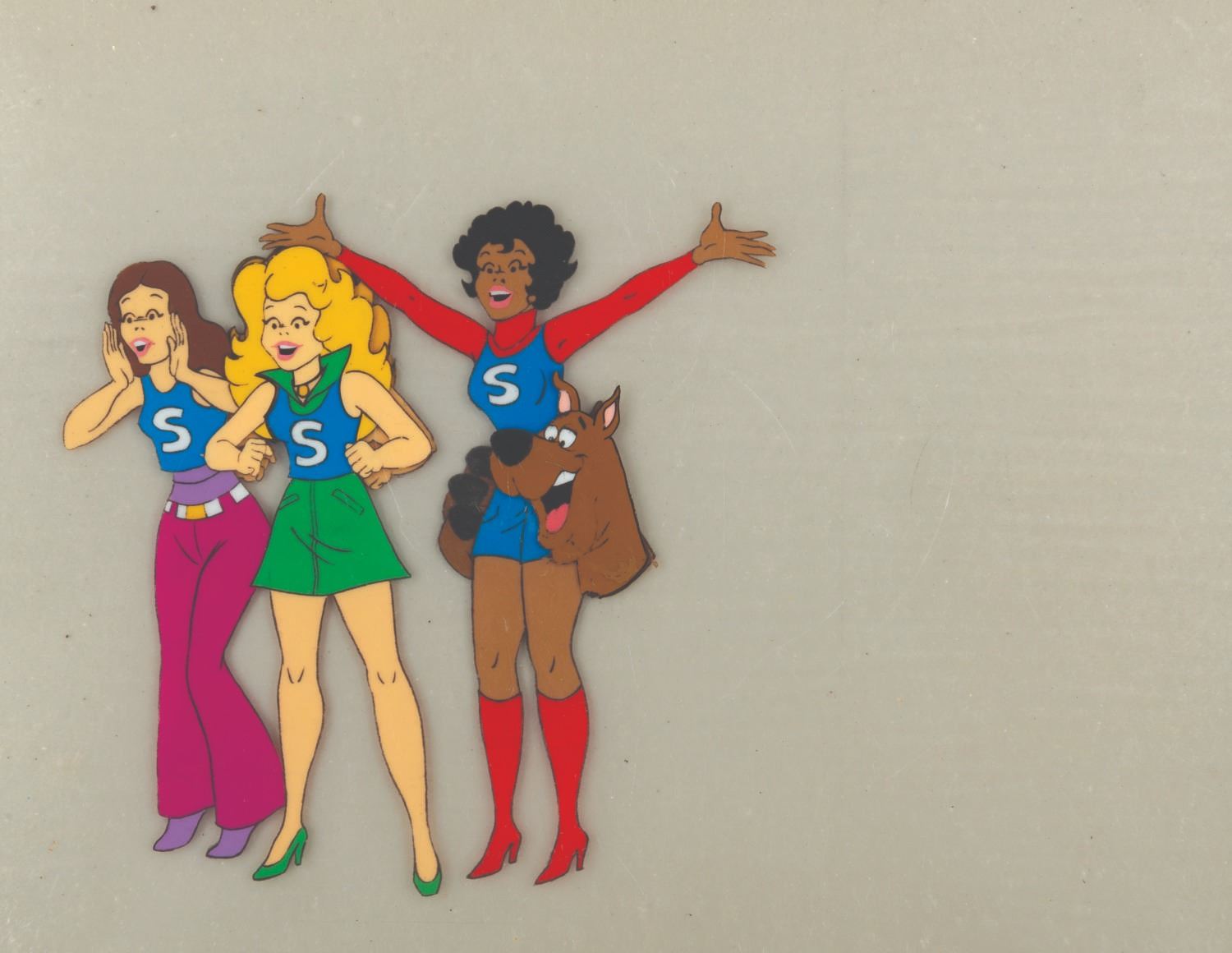 (Hanna-Barbera, 1977-78) A multi-layer cel from"Laff-A-Lympics" of Scooby Doo’s face along with the Teen Angels from Captain Caveman. Included are six extra layers with alternate expressions for Scooby and two of the Angels. With an image size of 6" x 6.25" on 10.5" x 12.5" cels, the piece dislays in very good condition with slight line loss and paint lifting to some layers.