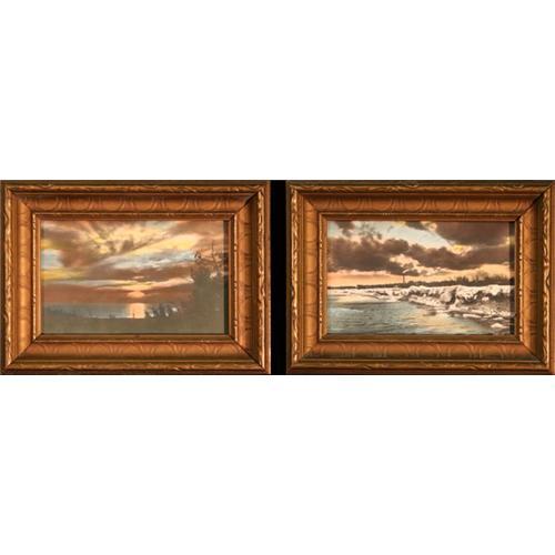 ?A Lake Huron Sunset? and ?Lake Huron in Winter? are two spectacular work of art done by the very creative Canadian artist, Kincardime. This imaginative artist has taken two splendid vintage black and white postcards of views of Lake Huron, MI and tinted them with marvelous colors. While black and white prints are very striking due to the bold contrast between the two colors, the color that is seen here is exceptional and makes these pieces very unique. The soft pinks, yellows, and blues have manifested into inspiring sunsets, which are even further set off by the dark clouds and the reflections seen in the water. There is also a hazy feel to these pieces that is reminiscent of a vintage photograph. These two are truly companion works of art, with the first piece depicting a lovely sunset during the summer, and the second displaying the beauty of a winter sunset with a snowy shoreline. The frame that was chosen for these two pieces is a beautiful gold wood frame that is decorated with ornate motifs that make these delightful works of art even more charming. In their entirety, both pieces measures 7 ¼? x 5 ¼?, this includes the frame. Adding a vintage flare to your home has never been easier for such an excellent price.
