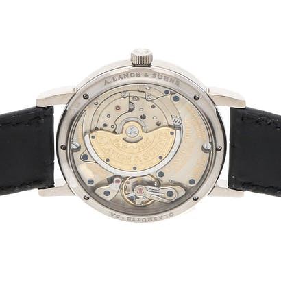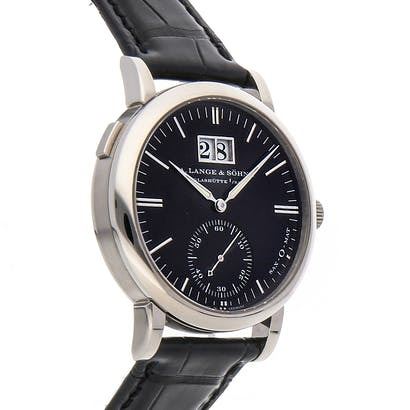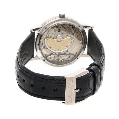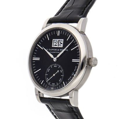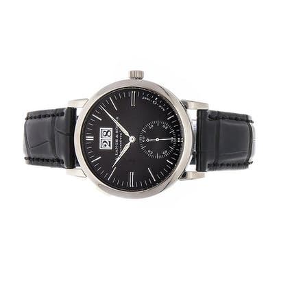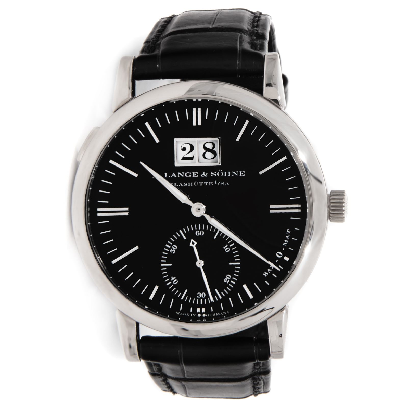 Self-winding automatic watch, features a 37mm 18k white gold case surrounding a black dial on a brand new black alligator strap with an 18k white gold tang buckle. Functions include hours, minutes, small seconds, and date. This watch comes complete with box and papers.