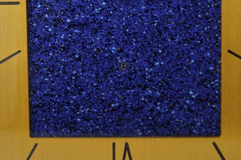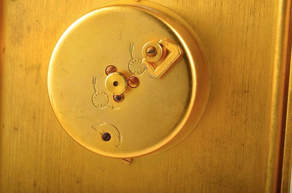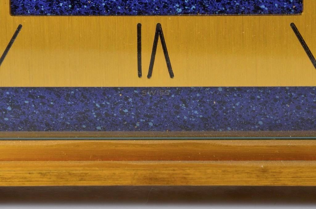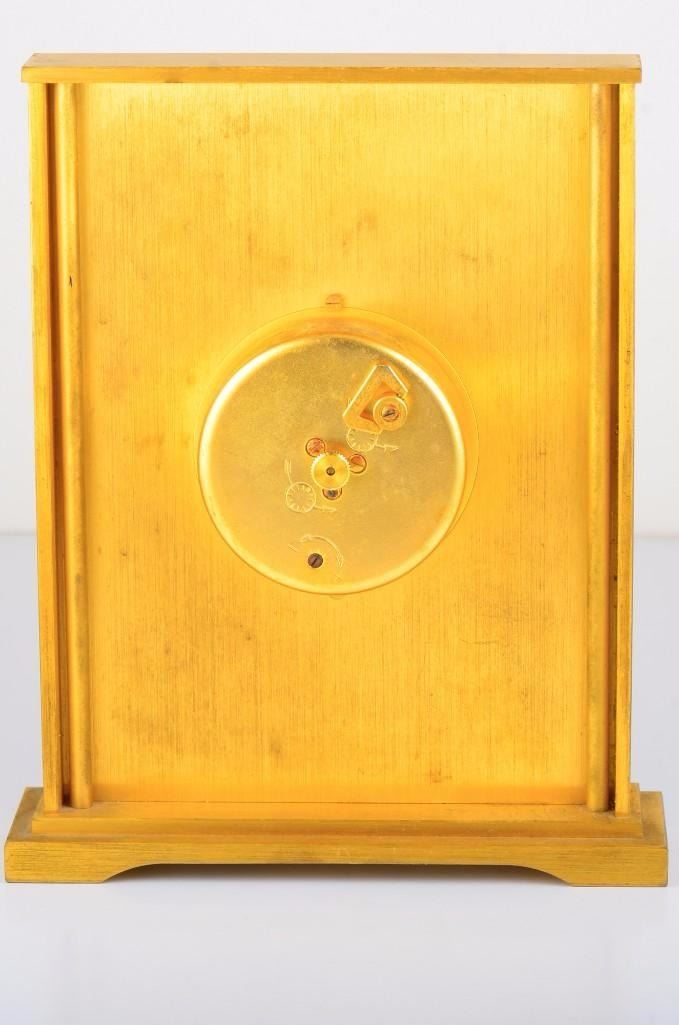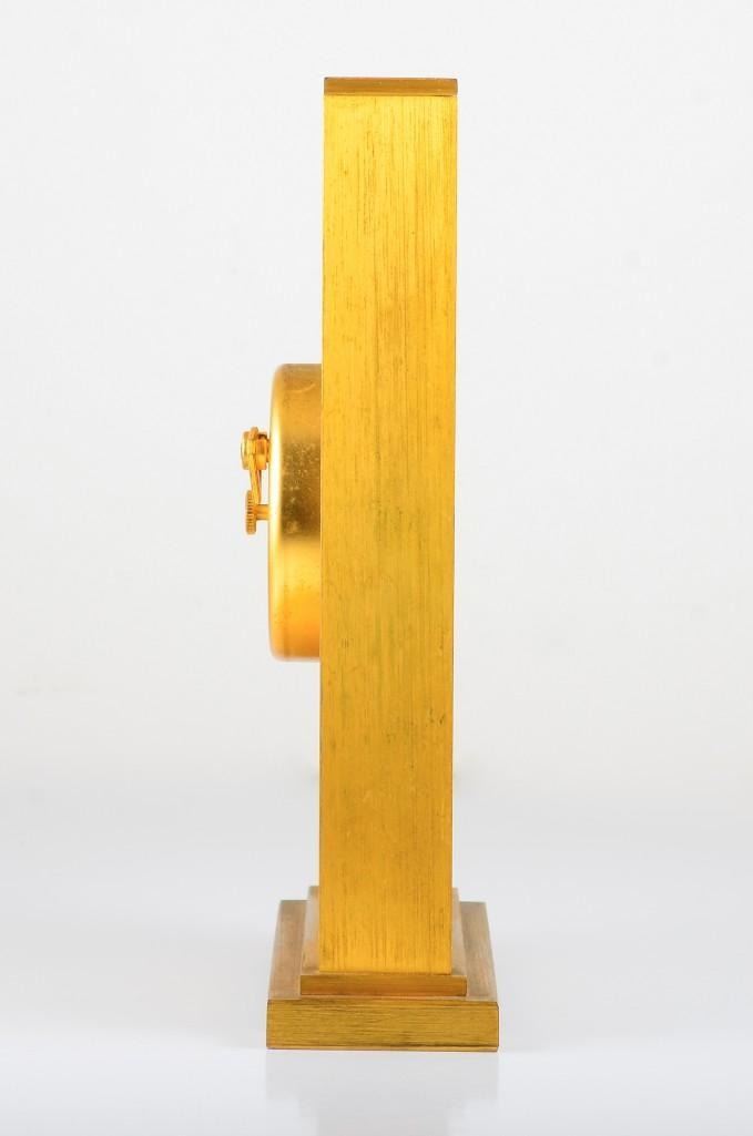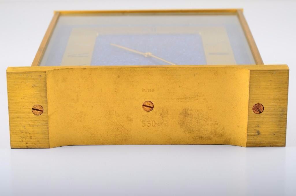 Jaeger Le Coutre desk clock. Base metal. Signed Swiss 530. Measures approx 4 1/8 inches x 5 5/8 inches.