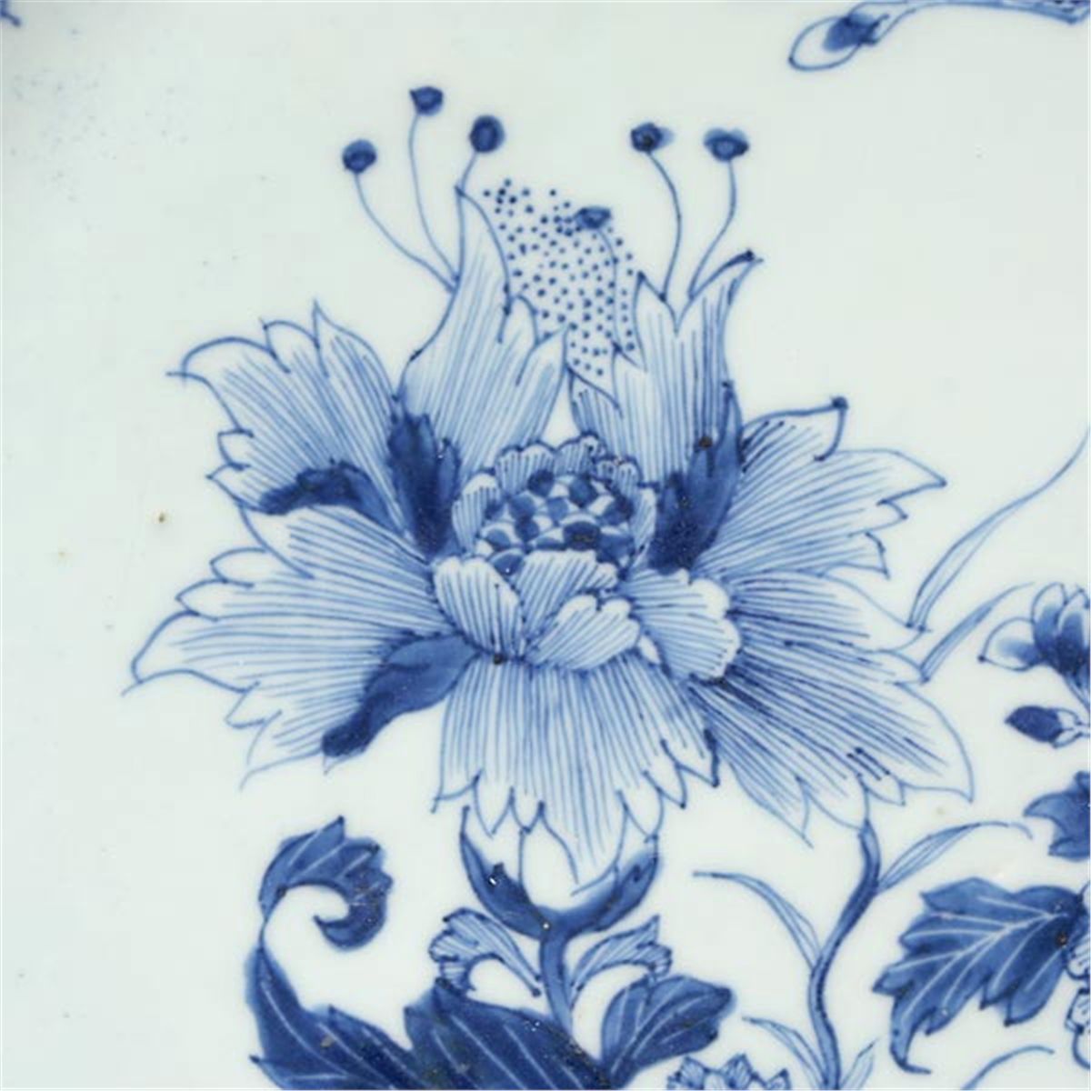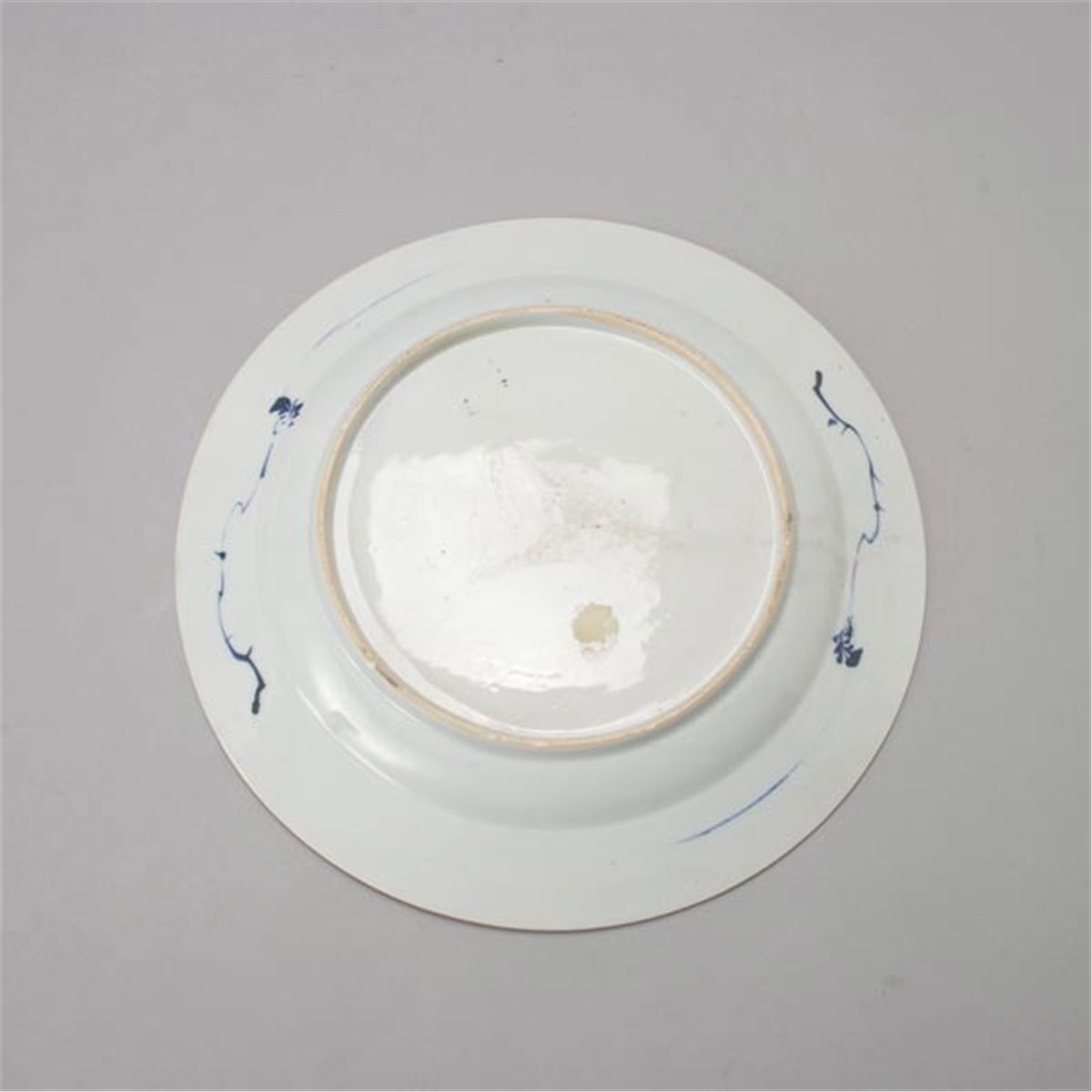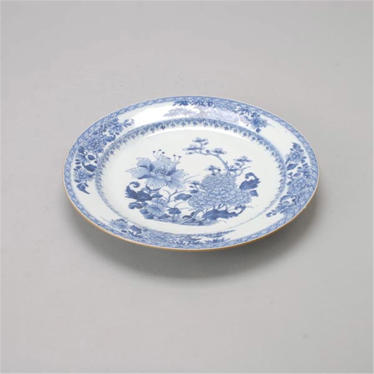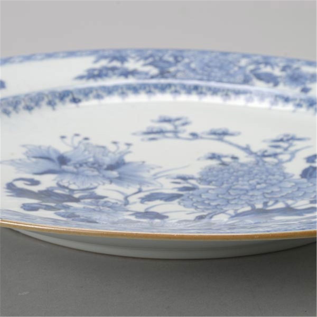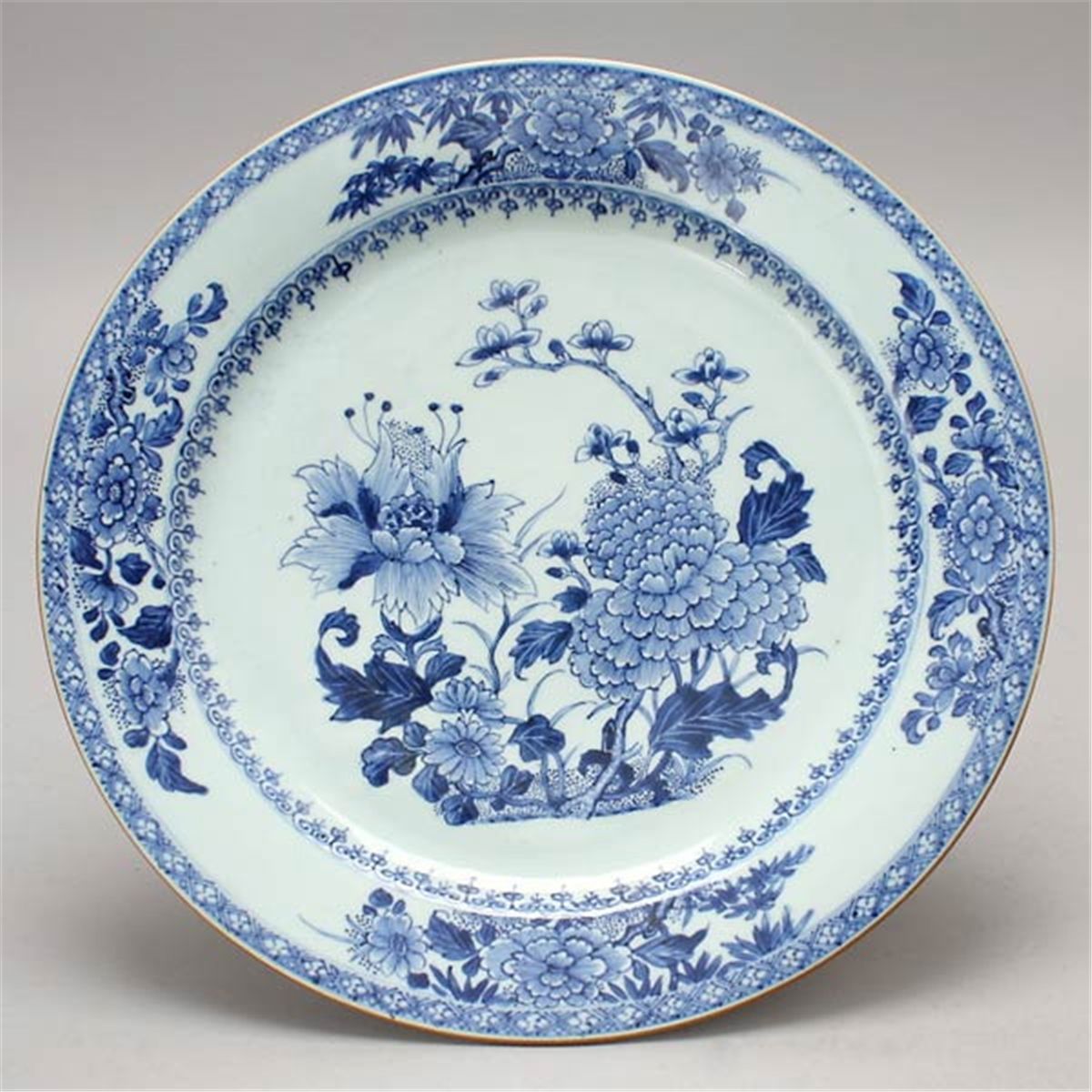 A Large Blue and White Export Porcelain Dish, The roundel painted with blooming plants and trees issuing from lush grass below, the cavetto decorated with leafy peonies in between a diamond and stylized scroll pattern, golden brown painted rim. 18th Century, Diameter: 14 5/8 inches (37.1 cm) Provenance:Acquired in Europe during the late 1940's. [Surface scratches, small chips to the foot rim, minor crazing. This condition report states major condition issues only.]